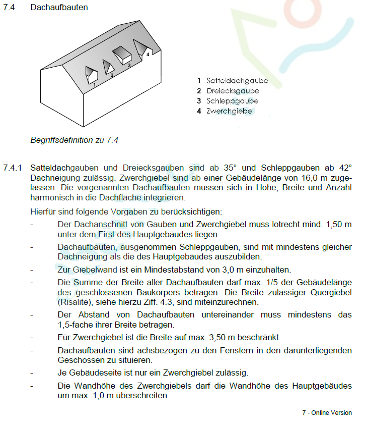 Dieser eingeschränkte Prüfungsmaßstab bei der Duldungsanordnung gegenüber obligatorisch Berechtigten dürfte grundsätzlich im Falle nachträglicher Änderung zugunsten des zum Rückbau Verpflichteten ebenfalls zur Anwendung kommen. Dies kann vorliegend aber sogar offenbleiben, da die streitgegenständlichen Dachgauben auch nach der am 1. Januar 2019 in Kraft getretenen OGS vom 4. Dezember 2018 nicht genehmigungsfähig sind. Die Schleppgauben nach Osten und Westen überschreiten jeweils die nach Nr. 7.4.1 Satz 3 Spiegelstrich 5 der OGS vom 4. Dezember 2018 zulässige Breite von 1/5 der Gebäudelänge. Nach Osten und Westen hat das Gebäude jeweils eine Länge von ca. 14,60 m. Maximal zulässig sind deswegen Dachaufbauten mit einer Summe der Breite von ca. 2,12 m. Die zwei Schleppgauben pro Gebäudeseite haben in Summe jeweils eine Breite von 5 m (2 x 2,50 m). Nach Nr. 7.4.1. Satz 3 Spiegelstrich 6 der OGS vom 4. Dezember 2018 ist ein Zwerchgiebel auf maximal 3,50 m beschränkt. Der Balkon mit Zwerchgiebel auf der Südseite ist 5,30 m breit. Für keine der streitgegenständlichen Dachaufbauten sind Anhaltspunkte für einen Anspruch auf eine satzungsimmanente Ausnahme oder eine Abweichung von der Ortsgestaltungssatzung ersichtlich.