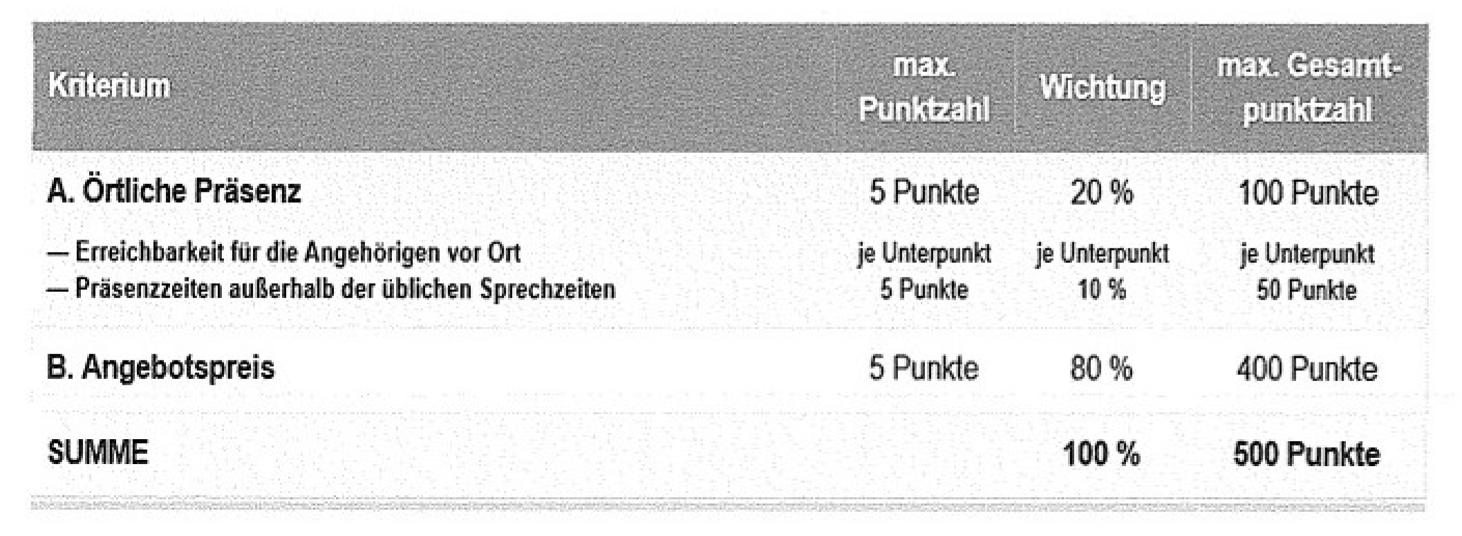 In den Vergabeunterlagen traf die Vergabestelle bezüglich der Zuschlagskriterien folgende Festlegungen: