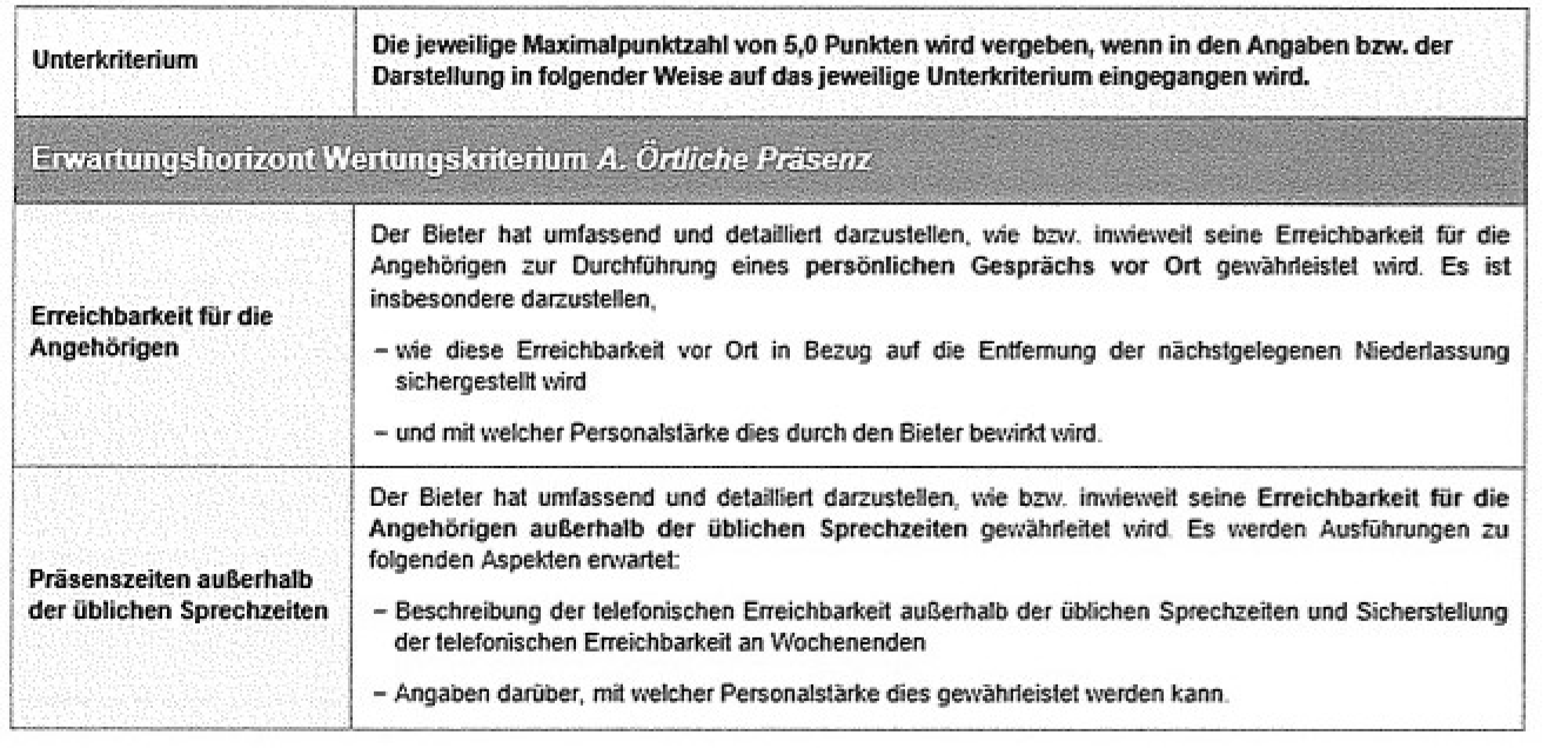Bei der Darstellung des Erwartungshorizonts unter Ziffer 12 der Aufforderung zur Angebotsabgabe sei ein redaktioneller Fehler enthalten. Gemäß Ziffer 11 sollte bezüglich des zweiten Unterkriteriums („Präsenzzeiten außerhalb der üblichen Sprechzeiten“) lediglich die Erreichbarkeit außerhalb der Geschäftszeiten dargestellt werden und nicht die Erreichbarkeit für Angehörige. Dies wäre auch für die Bieter aus dem Gesamtzusammenhang erkennbar gewesen. Dies führe jedoch nicht zur Intransparenz des Bewertungskriteriums. Vielmehr sei dieser offensichtliche Fehler für die Bieter erkennbar gewesen. Kein Bieter sei auf die Erreichbarkeit der Angehörigen außerhalb der Geschäftszeiten eingegangen, so dass davon ausgegangen werden könne, dass die Bieter dieses Missverständnis erkannten. Der Fehler sei somit nicht zu Lasten der Bieter gegangen.