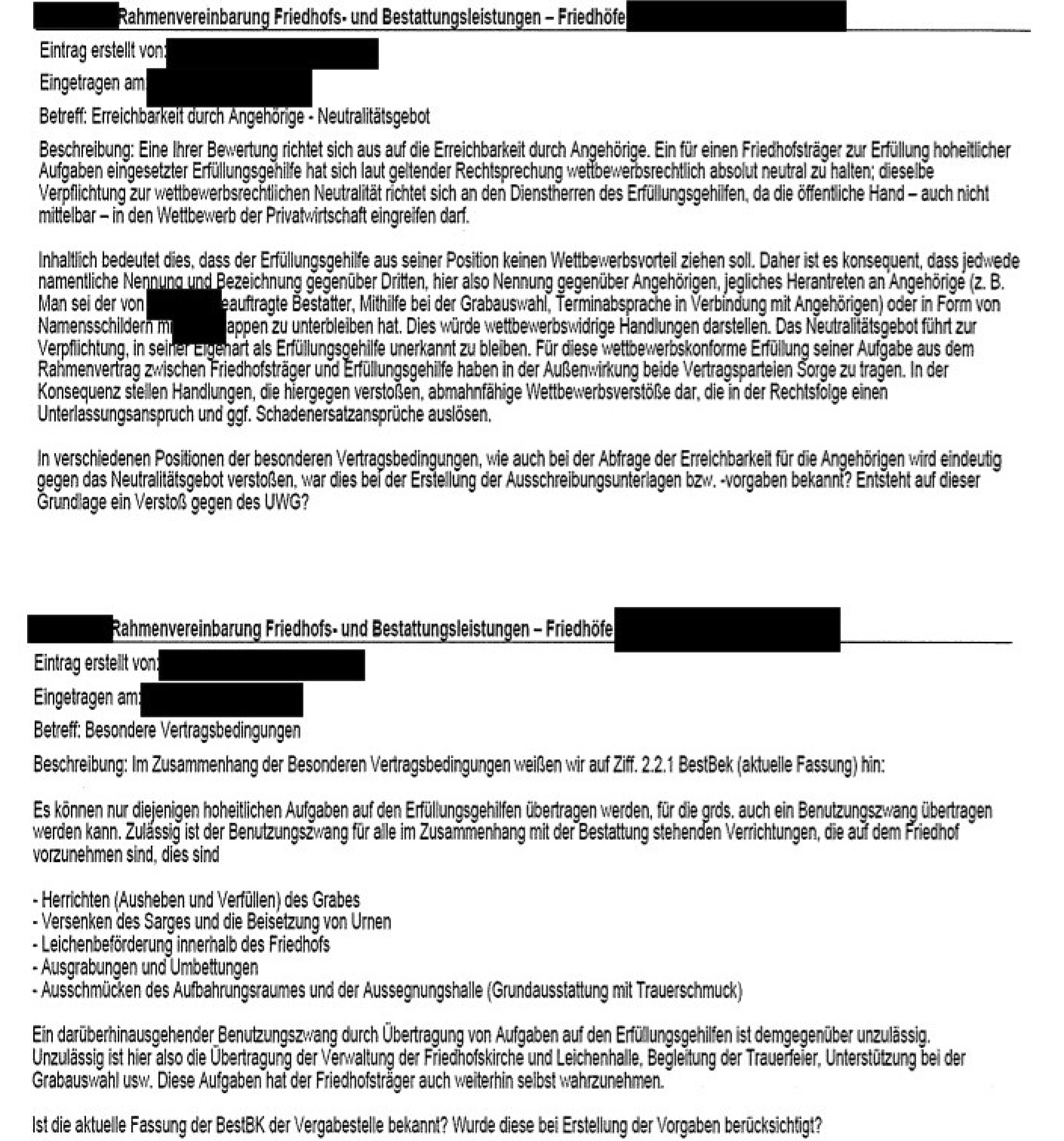 f) Präkludiert ist der Antragsteller mit seinen Rügen, dass das Wertungskriterium „Erreichbarkeit für die Angehörigen“ gegen das Neutralitätsgebot verstoßen würde bzw. dass die Besonderen Vertragsbedingungen der Vergabeunterlagen gegen die BestBek verstoßen würden. Der Antragsteller hat mit seinen beiden Bieterfragen vom 05.11.2020 deutlich gemacht, dass ihm die Problematik der Neutralitätspflicht eines … Erfüllungsgehilfen in Bezug auf die ausgeschriebenen Dienstleistungen bekannt ist und er Verstöße gegen die BestBek und des UWG als möglich erachtet. Gemäß § 160 Abs. 3 Nr. 1 GWB hätte der Antragsteller zehn Tage nachdem ihm die vermeintlichen Verstöße aufgefallen sind, eine entsprechende Rüge erheben müssen. Der Antragsteller kann nicht lediglich entsprechend umformulierte Fragen einreichen, sich mit den Antworten der Vergabestelle zufriedengeben und erst nachdem ihm das bekannt gegebene Wertungsergebnis nicht entspricht, diese vermeintlichen Vergabeverstöße wieder ins Nachprüfungsverfahren einführen. Der Antragsteller hat in der Laiensphäre die rechtliche Problematik erfasst. Der Einwand der Verfahrensbevollmächtigten des Antragstellers, dass der Antragsteller nur den Verstoß gegen die BestBek und gegen das UWG erkannte habe, aber nicht die Vergaberechtwidrigkeit, ist verfehlt, da der Antragsteller die BestBek bzw. das UWG als vergaberechtliche Anknüpfungsnorm selbst anführt, die Voraussetzung ist, damit ein behaupteter Verstoß im Nachprüfungsverfahren geprüft werden kann.