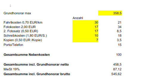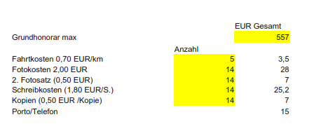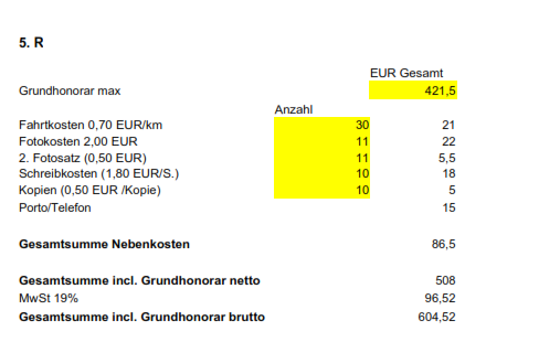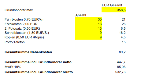 Fahrtkosten: 0,70 €/km Fotokosten mit 2,00 €/Lichtbild und 0,50 € je Lichtbild des zweiten Fotosatzes Porto/Telefon pauschal 15,00 € Schreibkosten mit 1,80 €/Seite und 0,50 €/Kopie Weitere Nebenkosten sind nicht erstattungsfähig, da sie entsprechend der Umfrage nicht üblich sind, letztlich als Teil des Grundhonorars und nicht als gesondert zu vergüten anzusehen sind. Hierzu zählen beispielsweise Stundenlöhne für die Fahrtzeit, Kosten für den Ausdruck des Originalgutachtens.