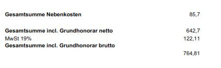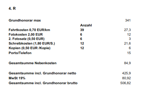 Hinsichtlich der Nebenkosten ist zu berücksichtigen, dass die Forderung von „Nebenkosten“, die u.U. nicht genau den tatsächlichen Aufwand abbilden, sondern „versteckte Gewinnanteile“ enthalten, in Deutschland/München von zahlreichen - wenn nicht allen Sachverständigen - erfolgt, also absolut üblich ist.