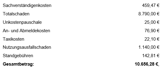2. In der Höhe ist von einem erstattungsfähigen Schaden in Höhe von 10.656,28 € auszugehen. Des Weiteren erscheint ein Schmerzensgeld von 600,00 € bei Einrechnung der unfallbedingten Beeinträchtigungen und der Verletzungsfolgen angemessen. Hinsichtlich der in der Höhe streitigen Positionen gilt Folgendes: