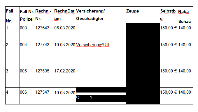 Die der Höhe nach angemessenen Gesamtrechnungssummen wurden im Anschluss an die erfolgte Reparatur durch die Firma „A.glas“ bei der jeweiligen Versicherung zur Schadensregulierung eingereicht, wobei durch Überreichung der entsprechenden Rechnung, die einen Selbstbehalt auswies, vorgespiegelt wurde, dass der Selbstbehalt durch den jeweiligen Kunden an die Firma „A.glas“ zu zahlen gewesen sei.
