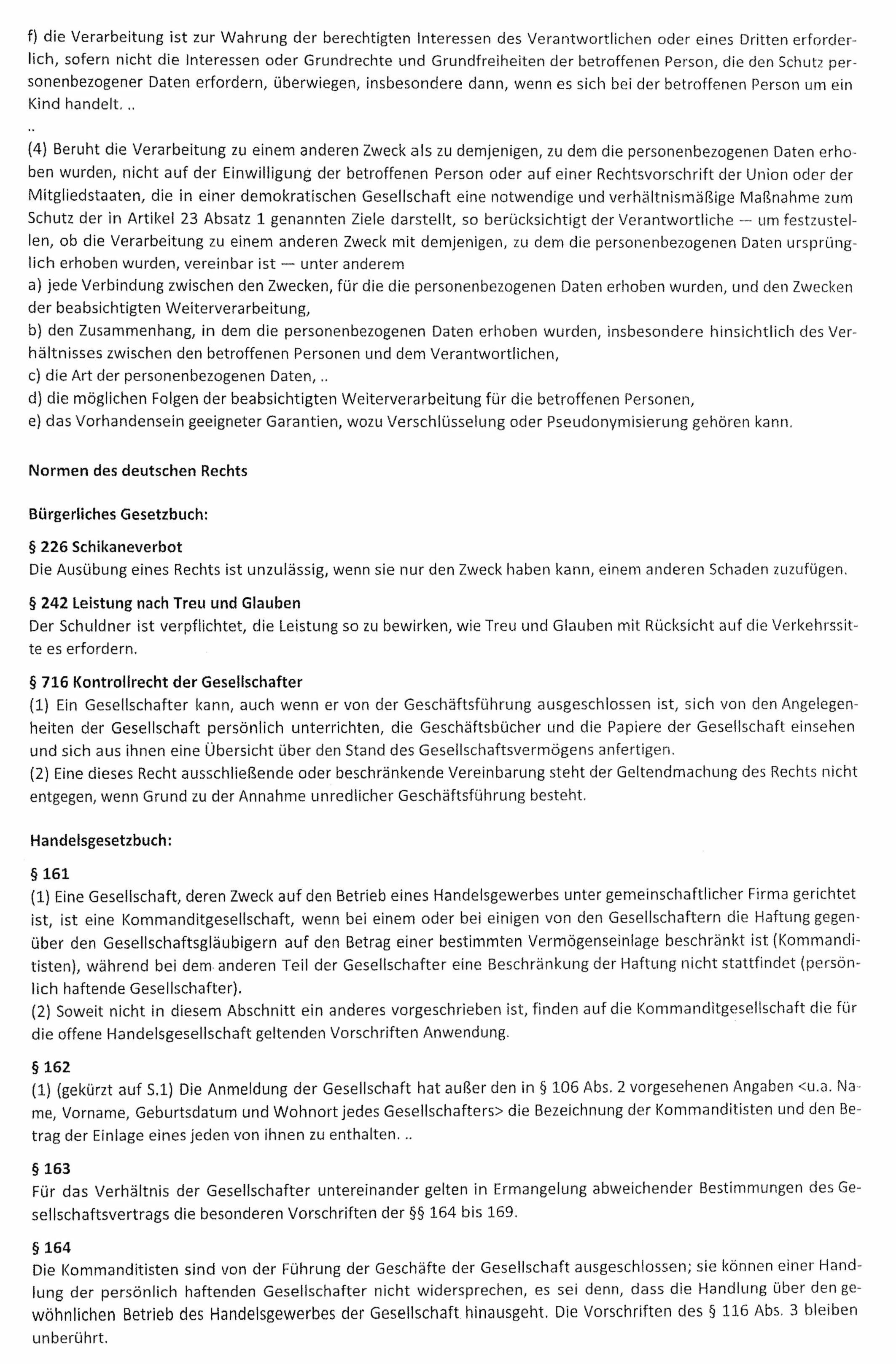 1a. Ergibt sich bei Auslegung von Art. 6 Abs. 1 lit. 1b und 1f Datenschutzgrundverordnung, dass bei einer Publikumspersonengesellschaft schon die Beteiligung an der Gesellschaft als nicht persönlich und nur gering haftender und nicht geschäftsführender Gesellschafter genügt, um „berechtigtes Interesse“ an Auskunft über alle mittelbar über einen Treuhänder beteiligten Gesellschafter, deren Erreichbarkeit und deren Beteiligung an der Publikumspersonengesellschaft zu bejahen und dem Gesellschaftsvertrag eine entsprechende vertragliche Verpflichtung zu entnehmen,