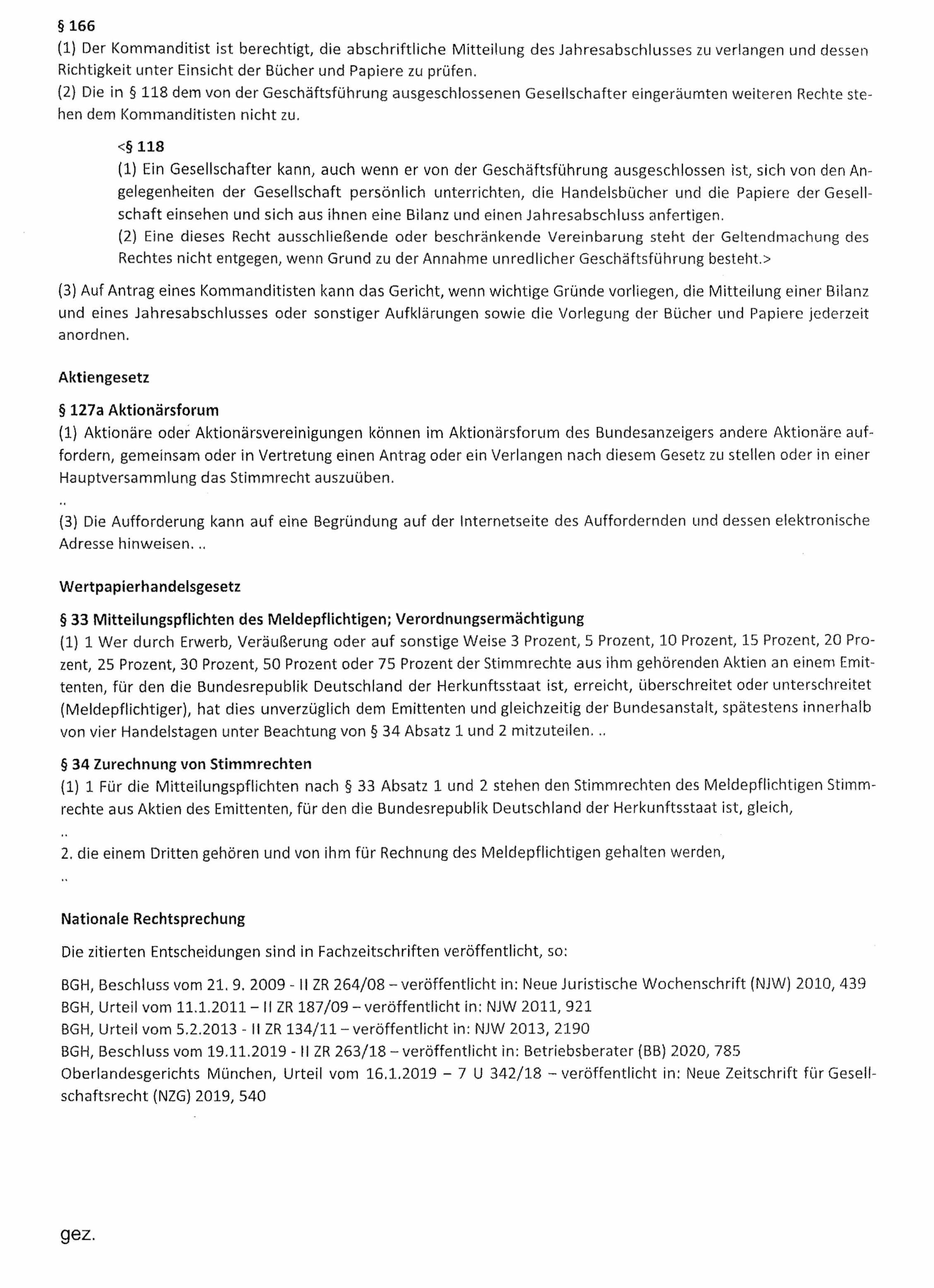 Stattdessen hält das Gericht es für naheliegend, eine förmliche Quote anzunehmen, ähnlich der Quote, bei der Mitteilungspflicht bei börsennotierten Aktiengesellschaftern entsteht, weil ab dann ein maßgeblicher Einfluss auf die Gesellschaft auch formell in Betracht kommt, wie es in § 33 des deutschen Wertpapierhandelsgesetz mit einer Quote von 3 % zum Ausdruck kommt. Dessen analoge Anwendung wurde zwar bisher vom Bundesgerichtshof abgelehnt. Europäische Vorgaben würden aber eine analoge Anwendung zumindest wieder in Betracht kommen lassen.