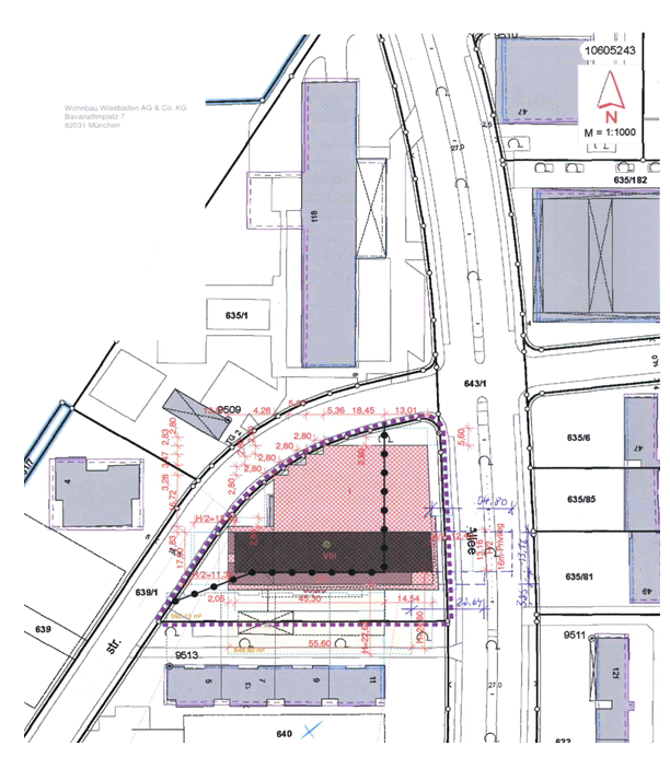 Die Klägerin ist Eigentümerin des Grundstücks FlNr. … Gemarkung …, …str 49/I (im Folgenden: Klägergrundstück). Dieses ist mit einem rein wohngenutzen Gebäude mit 8 Geschossen bebaut. Das Klägergrundstück ist durch die H1. Allee, einer mit Parkstreifen, Gehweg und Radweg insgesamt ca. 27 m breiten Hauptverkehrs straße, von dem westlich der H1. Allee anschließenden Grundstück FlNr. … Gemarkung …, H1. straße 3 (im Folgenden: Baugrundstück) getrennt. Das Baugrundstück ist derzeit mit einem Supermarkt mit zugehörigen Stellplätzen sowie einer Tiefgarage bebaut. Sowohl das Baugrundstück als auch das Klägergrundstück liegen im Geltungsbereich des Bebauungsplans Nr. … der Beklagten vom 31. Juli 1967 (im Folgenden: Bebauungsplan). Dieser setzt für das Klägergrundstück als Art der baulichen Nutzung ein Reines Wohngebiet (WR 5) fest. Für das Baugrundstück ist als Art der baulichen Nutzung zum Teil ein Kerngebiet, im südlichen Bereich ein Reines Wohngebiet (WR 4) vorgesehen. Durch Baugrenzen wird im nördlichen Bereich des Baugrundstücks ein eingeschossiger Baukörper mit einer Grundfläche von 625 m², im südlichen Bereich ein zweigeschossiger Baukörper mit einer Grundfläche von 280 m² zugelassen.