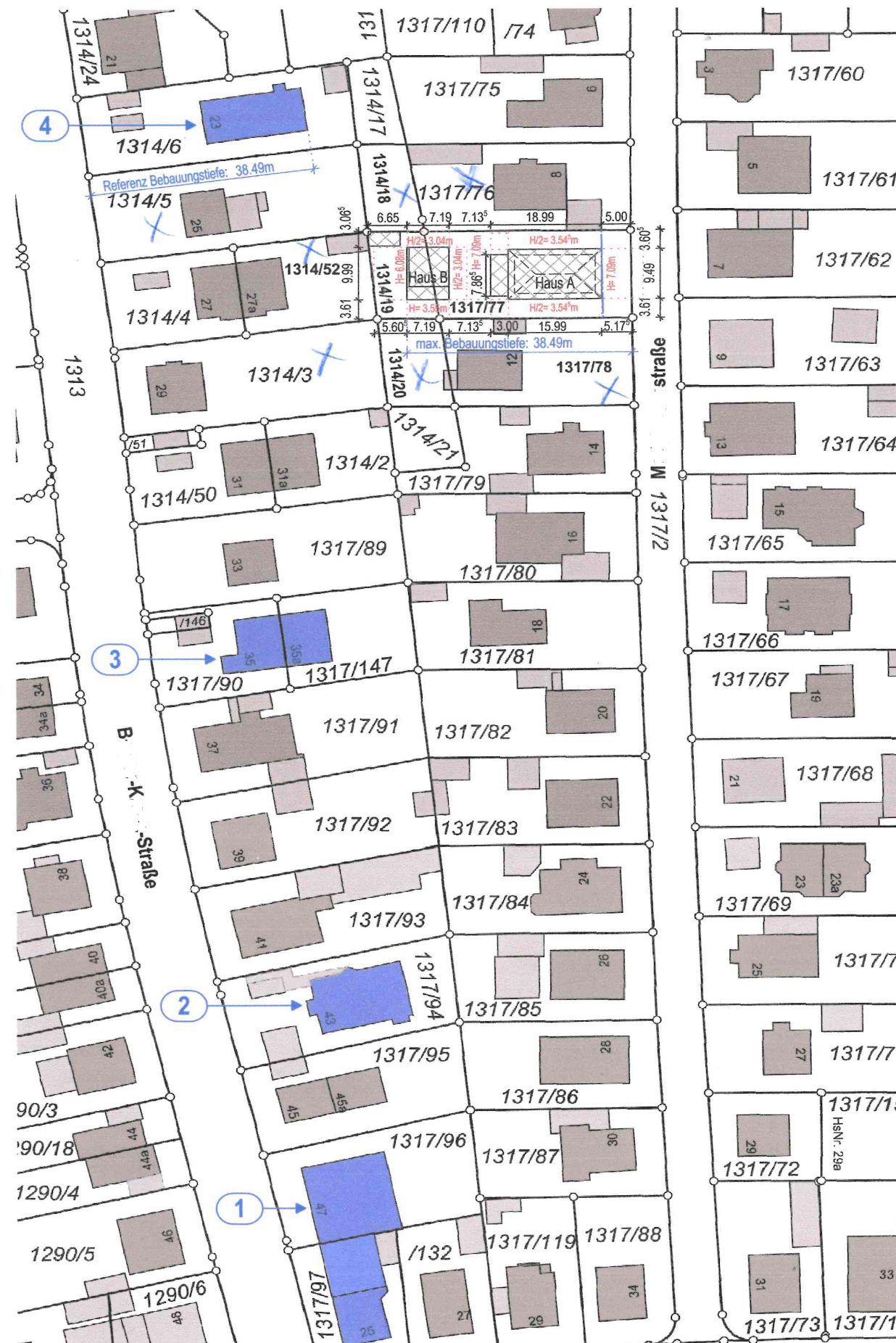 Die insgesamt 741 m² großen Vorhabengrundstücke befinden sich in einem im Norden von der J ... straße, im Westen von der B …K ... Straße, im Süden von der B ... straße und im Osten von der M ... straße begrenzten Geviert. Ein qualifizierter Bebauungsplan besteht nicht. Durch einfachen, übergeleiteten Bebauungsplan ist entlang der M ... straße, der J ... straße und der B …K ... Straße jeweils eine vordere Baugrenze festgesetzt.