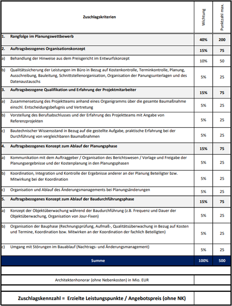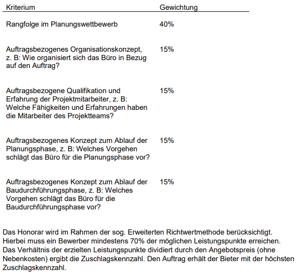 In der Wettbewerbsbekanntmachung war die elektronische Adresse angegeben, unter der die Auftragsunterlagen für einen uneingeschränkten und vollständigen direkten Zugang gebührenfrei zur Verfügung standen. Hierunter fanden sich auch die folgenden Zuschlagskriterien für das spätere Verhandlungsverfahren: