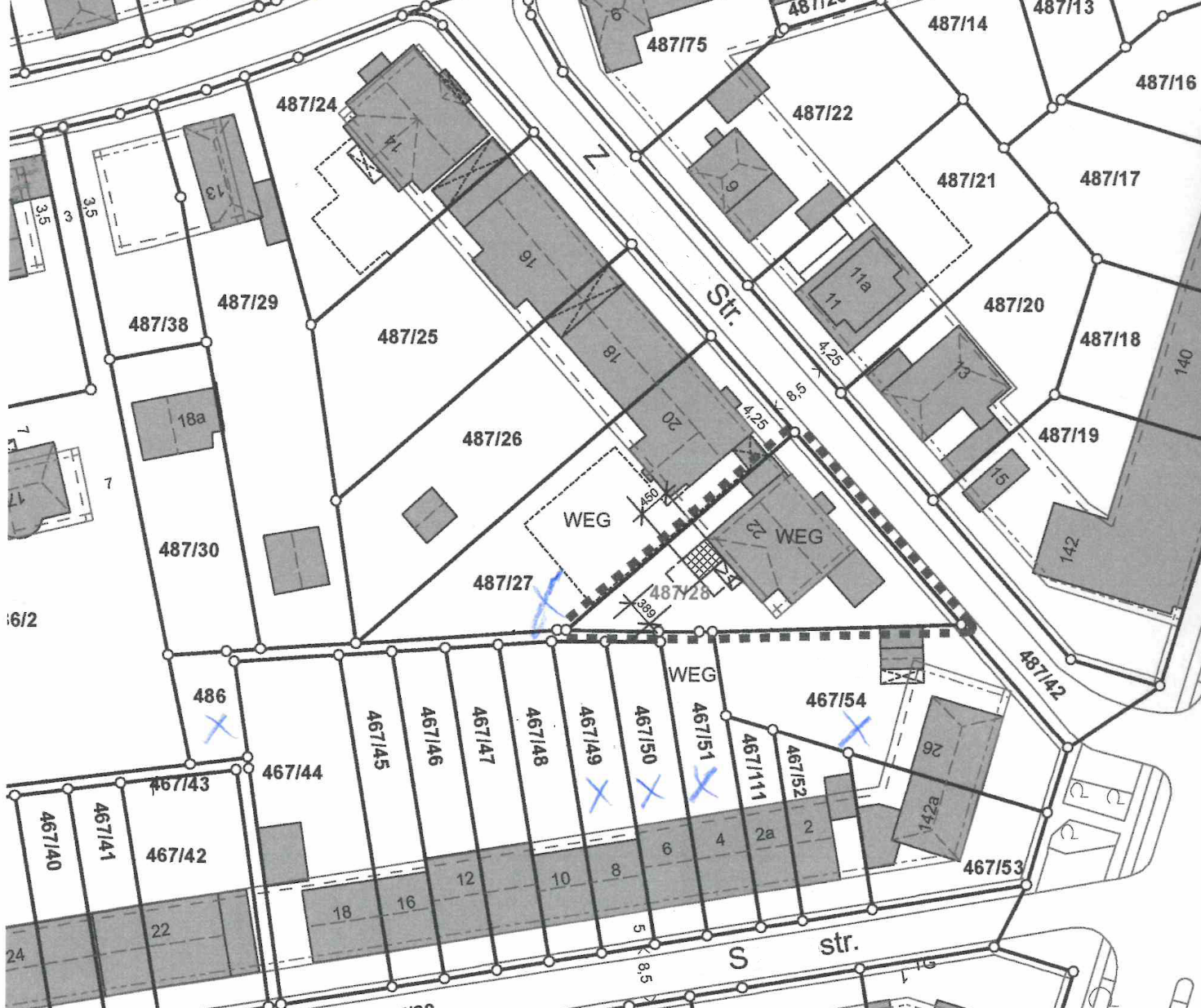 Das Anwesen liegt im Geviert … Straße, … straße, … straße und … straße. Im Geviert sind Bauräume durch straßenseitige und seitliche Baulinien sowie seitliche und rückwärtige Baugrenzen festgesetzt. Entlang der … Straße verläuft ein ca. 15 m tiefer Bauraum in einem Abstand von ca. 4 m zur Straße.