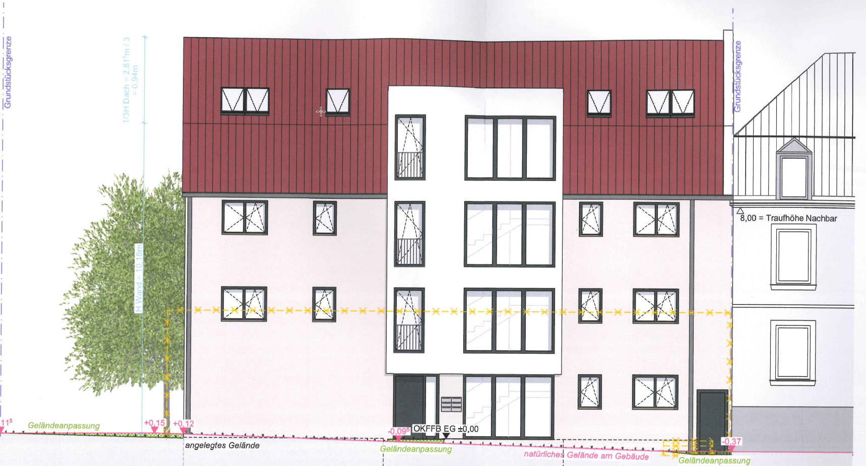 OSTANSICHT, Quelle Bauakte …, Az. … mit Bauantragsmappe der Stadt … Mit Bescheid vom 27. Oktober 2020 genehmigte die Stadt … der Beigeladenen die Errichtung eines Mehrfamilienhauses mit sechs Wohnungen und integrierten Garagen unter Einhaltung der Auflagen in Ziffer I. Nr. 1-19. Unter Ziffer II wurde eine Abweichung von Art. 6 Abs. 1 und 2 BayBO hinsichtlich der Nichteinhaltung der Abstandsflächen nach Süden zum Grundstück 1215/6 hin gewährt. Weiter wurde in Ziffer III eine Abweichung von Art. 6 Abs. 1 und 2 BayBO hinsichtlich der Nichteinhaltung der Abstandsflächen nach Westen zum Grundstück FlNr. … genehmigt.