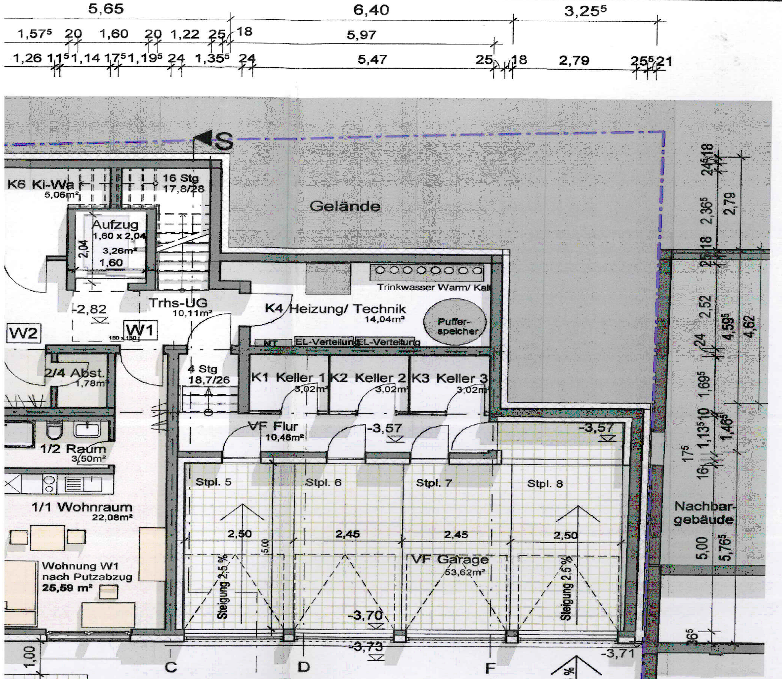 Gemäß den nach erneuter Aufforderung durch die Antragsgegnerin nachgebesserten eingereichten Bauvorlagen (Eingang 31. Januar 2022) soll das geplante Mehrfamilienhaus der Gebäudeklasse 3 mit Untergeschoss, Erdgeschoss, erstem und zweitem Obergeschoss in der nördlichen, bisher unbebauten Hälfte des Vorhabengrundstücks liegen und zur Straße … mit einer Auskragung, über die auch der Zugang zum Haus erfolgt und die Treppenhaus und Aufzug beherbergt, grenzständig stehen und im Übrigen etwa 3 m nach Süden zurückgesetzt sein. Das Untergeschoss tritt nach Norden (A… hin wegen des in Nord-Süd-Richtung abfallenden Geländes nicht äußerlich in Erscheinung, zur Ostseite hingegen wegen des (fiktiv festgesetzten) abfallenden Geländes in sukzessiver Weise etwa ab der Hälfte der Breite des Vorhabengebäudes. In diesem Bereich ist im Untergeschoss ein Teil des Garagentrakts untergebracht, der direkt an die Grenze zur Antragstellerin anschließt. Im Übrigen soll der Bereich zwischen der östlichen Außenwand des Vorhabengebäudes und der Grenze zur Antragstellerin bzw. der westlichen Außenwand deren Wohngebäudes nicht bebaut werden, lediglich ist im nördlichen Abschnitt auf Erdgeschossebene ein zur Antragstellerin grenzständig angelegter Stellplatz vorgesehen (Stellplatz 4). Ein zweiter (Stellplatz 3), der parallel zur Straße A. liegt, ragt geringfügig in diesen Bereich hinein. Soweit nicht bebaut, sind von der östlichen Außenwand des geplanten Wohngebäudes der Beigeladenen - Erdgeschoss und erstes Obergeschoss - bis zur Grenze des Grundstücks der Antragstellerin auf Höhe kurz vor dem Ende der südlichen Außenwand des Vorhabengebäudes 3,15 m eingezeichnet, und am Beginn des nördlichen Drittels der östlichen Außenwand 3,29 m. Die östliche Außenwand des zweiten Obergeschosses, welches nach Westen hin, also von der Grenze zur Antragstellerin fliehend, zurückversetzt ist, liegt am südlichen Ende 4,40 m, am nördlichen Ende 4,57 m von der östlichen Grundstücksgrenze zur Antragstellerin hin entfernt. Die Abstandsflächen von der östlichen Außenwand des Vorhabengebäudes zur Antragstellerin hin sind zeichnerisch laut des vorgelegten Abstandsflächenplanes knapp bis exakt eingehalten, wobei eine festgesetzte, nicht die natürliche Geländehöhe zugrunde liegt. Keine Berücksichtigung findet dort der zwischen dem Vorhabengebäude und dem Wohngebäude der Antragstellerin liegende Teil des Garagentrakts.