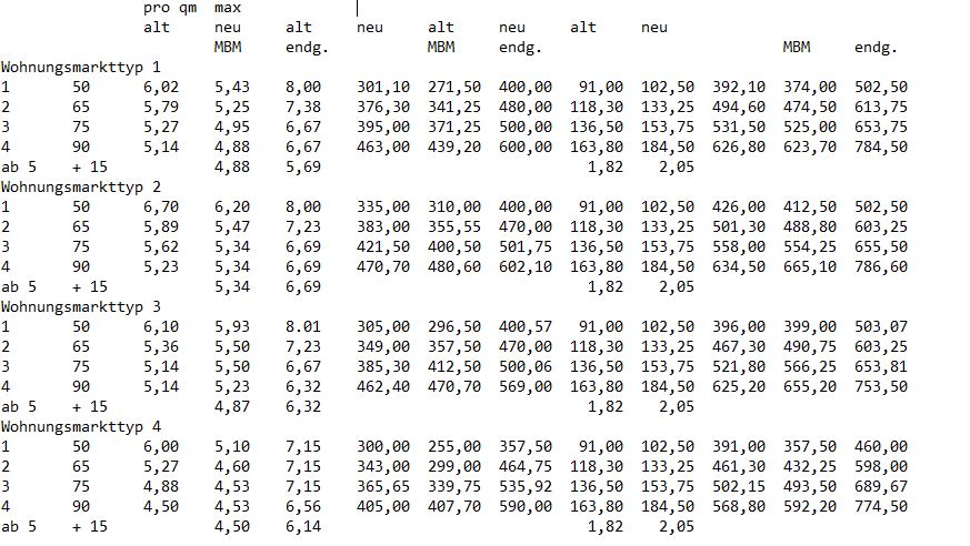 Die sich aus dieser auf den Median der nach dem „Aussortieren“ verbliebenen Bestandsmieten (zum Großteil von Transferleistungsempfängern und im übrigen Teil fast ausschließlich auf Werten aus dem sozialen Wohnungsbau) festgesetzte vorläufige „maximal angemessene Kaltmiete neu“ lag für 11 von den insgesamt 16 Haushaltsgrößen in den 4 Wohnungsmarkttypen des Landkreises (zum Teil um ca. 10%) unter den 2 Jahren zuvor vom Landkreis als angemessen festgesetzten Werten.