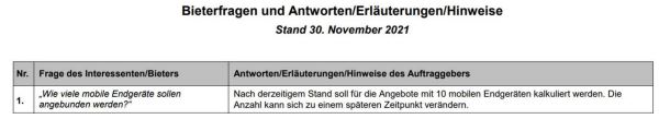 Dagegen sei das Angebot der BGl zwingend auszuschließen. Auf die Bieterfrage „Wie viele mobile Endgeräte sollen angeboten werden?“ habe die VSt geantwortet: „Nach derzeitigem Stand soll für die Angebote mit 10 mobilen Endgeräten kalkuliert werden. Die Anzahl kann sich zu einem späteren Zeitpunkt verändern“.