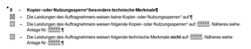 Die ASt entfernte jedoch in ihrem Angebot im Vertrag über die Überlassung von Standardsoftware unter Ziffer 8 das von der VSt voreingetragenen Kreuz. Stattdessen setzte sie ihr Kreuz bei einem anderen Platzhalter und machte folgende Angabe: „Die Leistungen des Auftragnehmers weisen folgende Kopier- und Nutzungssperre auf: Nutzungssperre durch …“.