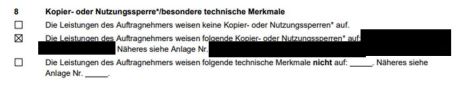 3. Im Vertrag über die Überlassung von Standardsoftware, der Teil der Vergabeunterlagen für das finale Angebot war, machte die VSt unter Ziffer 8 (Kopier- und Nutzungssperre) die Vorgabe, dass die Leistungen des Auftragnehmers keine Kopier- oder Nutzungssperren aufweisen dürfen (siehe nachfolgenden Screenshot).
