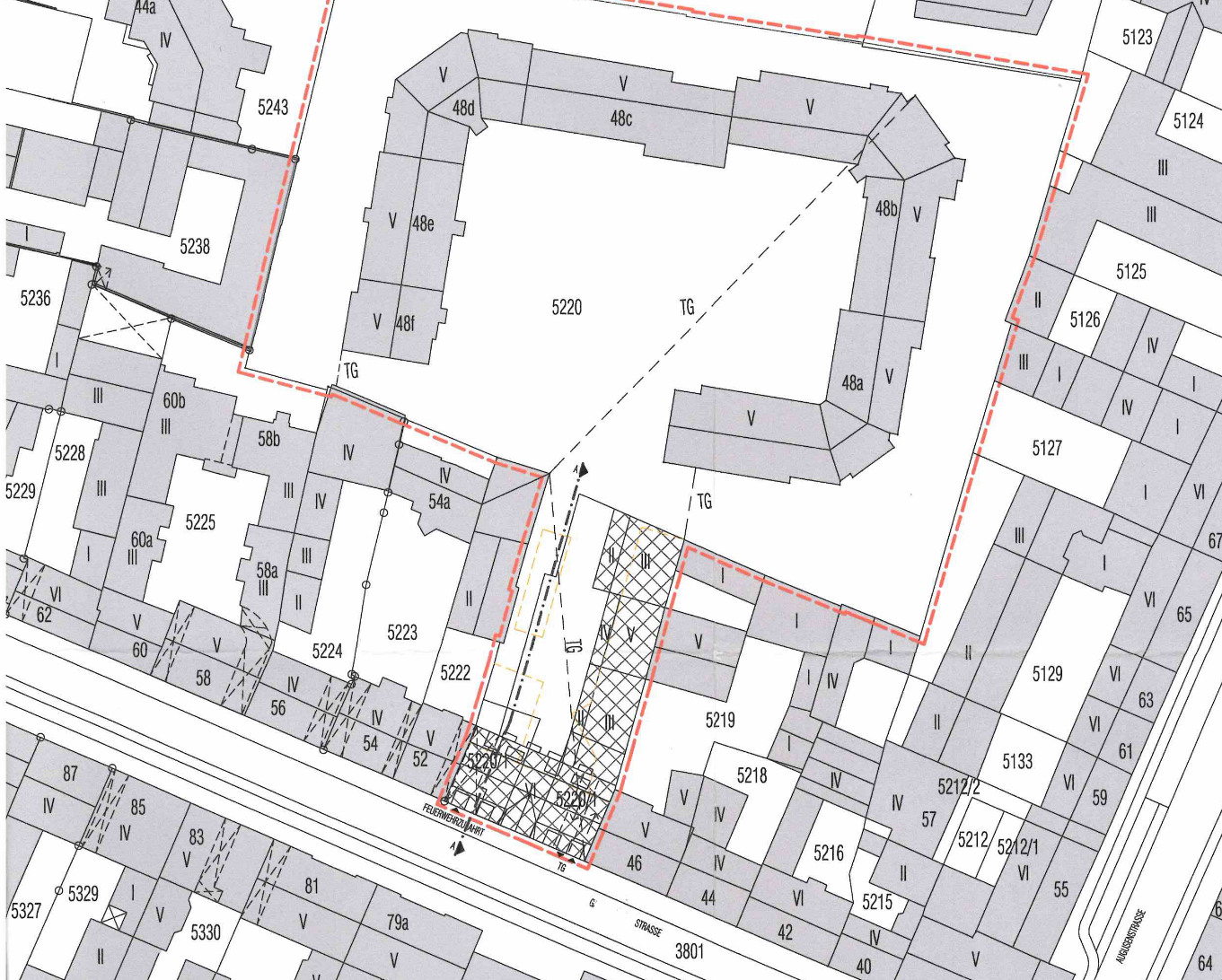 Westlich des Baugrundstücks liegen mehrere rückwärtige Innenhöfe, die jeweils an den seitlichen Grundstücksgrenzen be- und umbaut wurden. Die die Innenhöfe Richtung Norden abschließenden Rückgebäude sind teilweise an den seitlichen Grundstücksgrenzen weiter nördlich liegender Grundstücke, innerhalb der Grundstücke oder an den rückwärtigen Grundstücksgrenzen errichtet. Eine durchgängige Bebauung bzw. ein vollständig umschlossener Innenhof findet sich auf der Fl.Nr. … Die aneinandergebauten Rückgebäude sind drei- bis viergeschossig (Terrassengeschosse). Der von den Fl.Nrn. …, … und … gebildete Innenhof, der sich direkt westlich an das Vorhabengrundstück anschließt, ist auf der Ostseite zum Vorhabengrundstück hin zwischen Vorder- und Rückgebäude offen (ca. 15 m). Auf der Westseite befindet sich zwischen Vorder- und Rückgebäude auf der Fl.Nr. … eine unbebaute Lücke von wenigen Metern. Aufgrund der Massivität der diese schmale Lücke auf drei Seiten umgebenden Bebauung wirkt der Innenhof jedoch auch auf dieser Seite durchgängig umbaut. Die dort vorgefundenen, aneinander gebauten Rückgebäude sind ebenfalls drei- bis viergeschossig, wobei das Rückgebäude …straße 54a (Fl.Nrn. …*) über eine Dachterrasse auf dem vierten Obergeschoss sowie einen sich daran anschließenden turmartigen Aufbau verfügt.