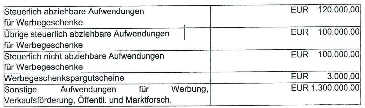 Für das Jahr 2012 war im Handlungskostenvoranschlag für die Rubrik Werbung ein Gesamtaufwand von EUR 1.623.000 vorgesehen und zwar im Einzelnen wie folgt:
