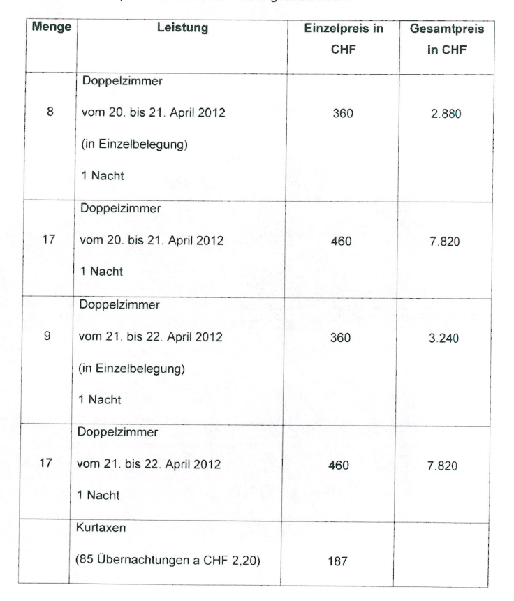Das Hotel … … rechnete seine Leistungen mit Rechnung vom 27.04.2012 ab. Der Rechnungsbetrag belief sich auf insgesamt 41.344,80 CHF, was 34.473,52 € entsprach. Er setzte sich wie folgt zusammen