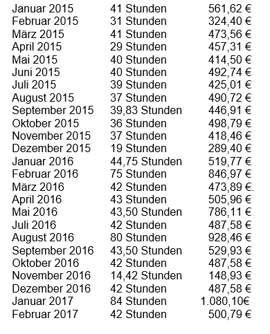 März 2016 30 Stunden 250,08 € April 2016 30 Stunden 255,00 € Mai 2016 45 Stunden 382,50 € Juni 2016 37,50 Stunden 318,75 € Juli 2016 52,50 Stunden 446,25 € August 2016 37,50 Stunden 318,75 € September 2016 22,50 Stunden 191,25 € Oktober 2016 52,50 Stunden 446,25 € November 2016 37,50 Stunden 318,75 € Dezember 2016 37,50 Stunden 247,59 € Januar 2017 67,50 Stunden 503,69 € Februar 2017 52,50 Stunden 503,69 €