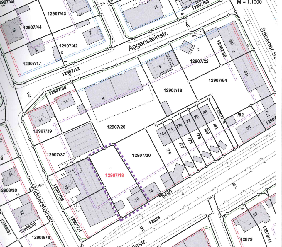 Vgl. zur Lage der Grundstücke und ihrer Bebauung anliegenden Lageplan, der das Baugrundstück und die umgebende Bebauung mit Baugrenzen und Baulinien ohne das geplante Vorhaben darstellt (aufgrund des Einscannens möglicherweise nicht maßstabsgetreu).