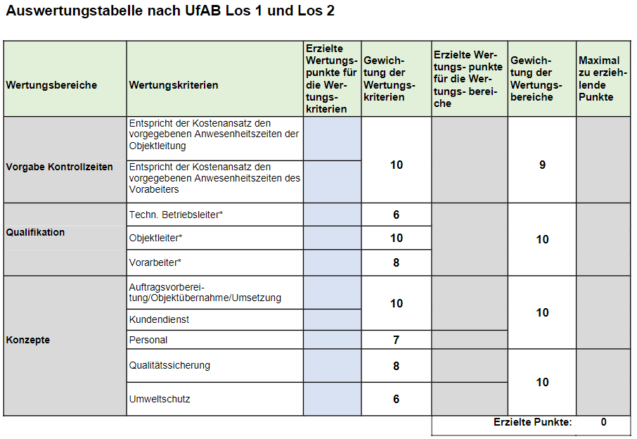 Die einzelnen Wertungsbereiche und Wertungskriterien sowie deren jeweilige Gewichtung war in nachfolgender Tabelle aufgeführt: