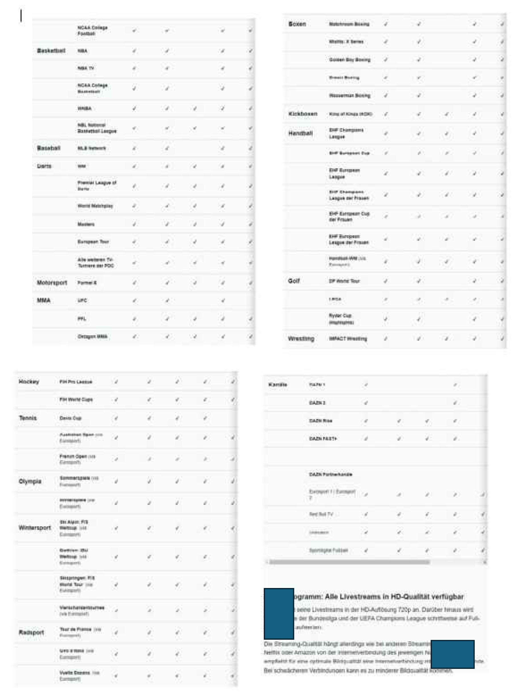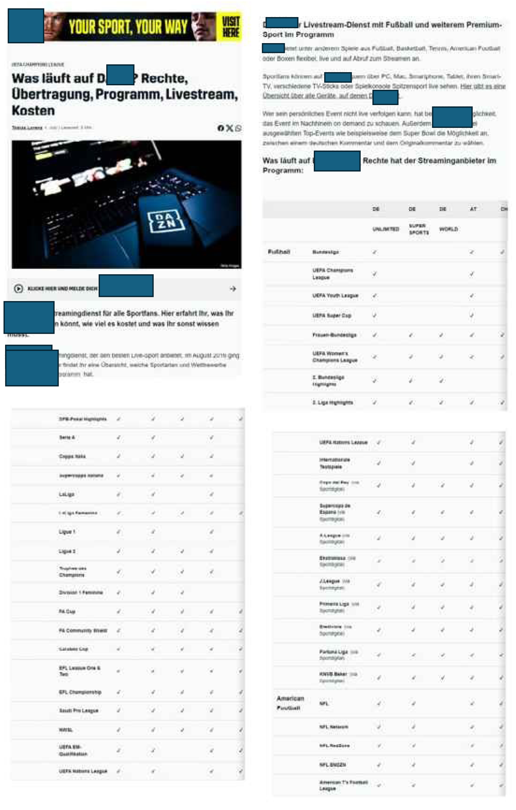 Wir bieten einen Online-Videodienst, der (unter anderem) die Übertragung von Sportereignissen (live und on-demand), Zusammenfassungen von Sportereignissen und andere ähnliche Inhalte bietet, deren Gestaltung und Verfügbarkeit mit der Zeit variieren kann (insgesamt „Inhalte“). Die Inhalte unterliegen gewöhnlich gewissen Beschränkungen (z.B. bestimmten Gebietsbeschränkungen) (…)