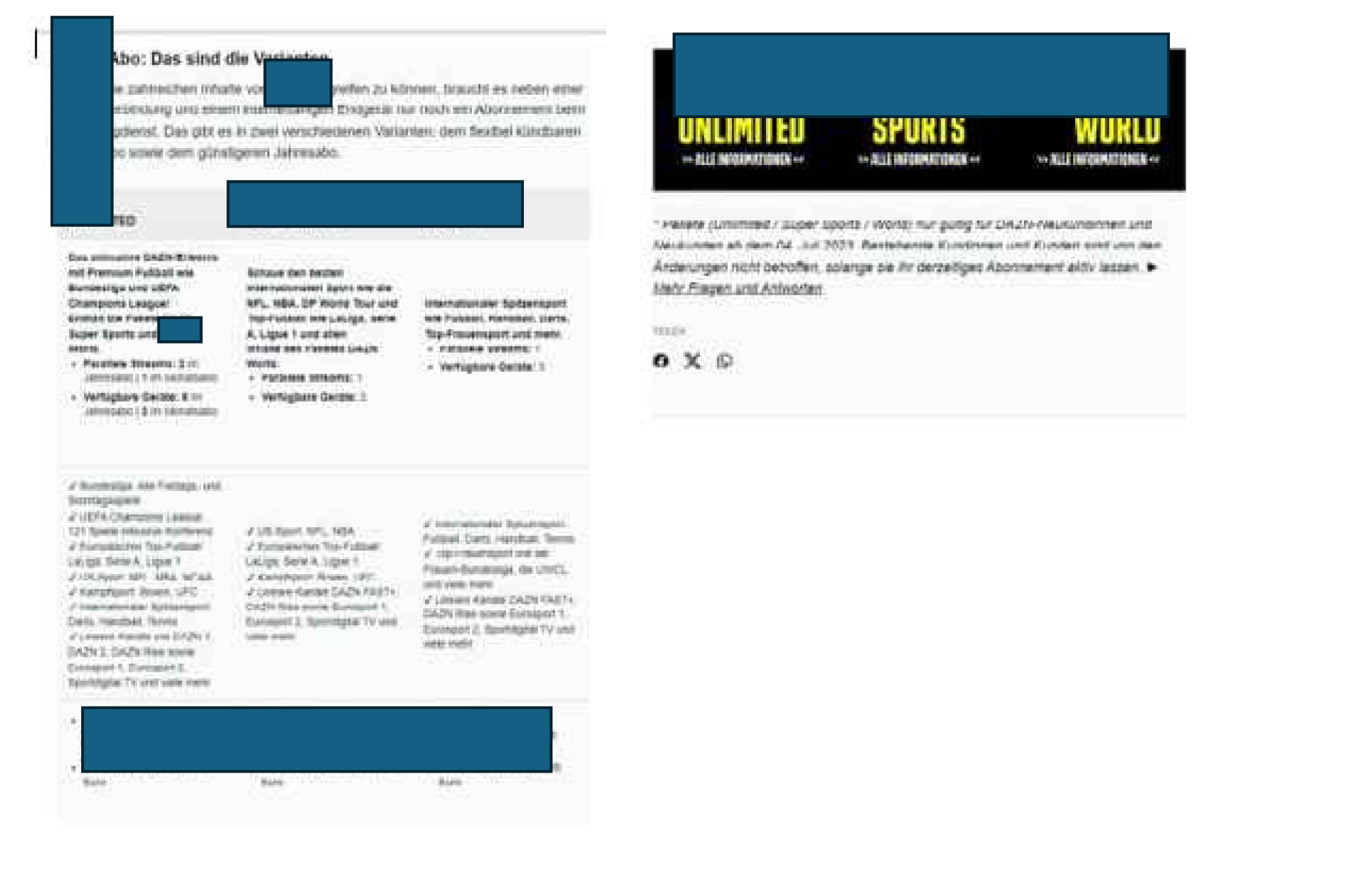 2.1. Wir bieten einen Online-Videodienst, der (unter anderem) die Übertragung von Sportereignissen (live und on-demand), Zusammenfassungen von Sportereignissen und andere ähnliche Inhalte bietet, deren Gestaltung und Verfügbarkeit mit der Zeit variieren kann (insgesamt „Inhalte“). Die Inhalte unterliegen gewöhnlich gewissen Beschränkungen (z.B. bestimmten Gebietsbeschränkungen).