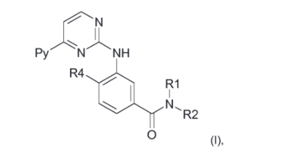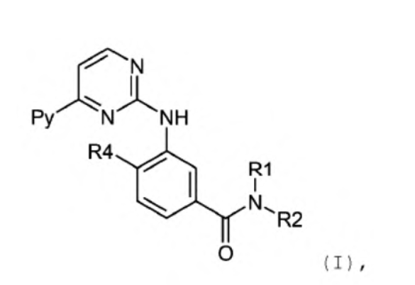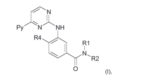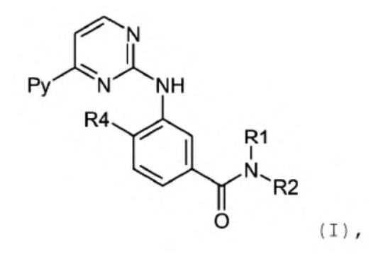 in welcher Py 3-pyridyl bedeutet, R1 für Wasserstoff steht, R2 für 5-(4-Methyl1H-imidazol-1-yl)-3-(trifluormethyl)-phenyl steht und R4 für Methyl steht; oder ein pharmazeutisch akzeptables Salz desselben, für die Verwendung bei der Behandlung von chronischer myeloischer Leukämie (CML),