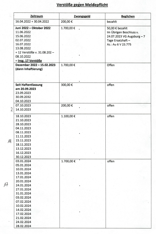 In der Zeit vom 6. April 2024 bis 1. Mai 2024 erfolgten nochmals sieben weitere Verstöße gegen die angeordnete Meldepflicht. Eine gesonderte Anhörung neben dem Vermerk im Schreiben vom 4. April 2024 erfolgte nicht.