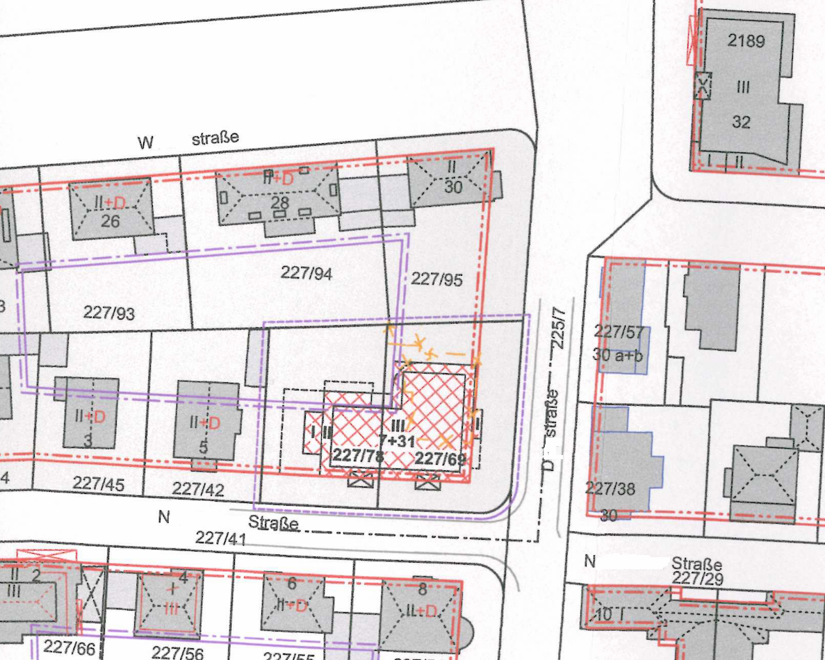 Das Baugrundstück liegt im Geviert D …straße, N … Straße, E … Straße und W …straße. Im Geviert sind Bauräume sowohl durch vordere Baulinien als auch durch seitliche bzw. rückwärtige Baugrenzen festgesetzt. Derzeit befindet sich auf dem Baugrundstück auf der FlNr. … ein zweigeschossiges Einfamilienhaus mit nachträglich ausgebautem Dachgeschoss. Die FlNr. … ist derzeit unbebaut.