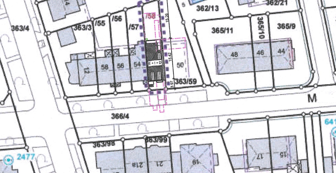 Auf dem klägerischen Grundstück wurde in jüngerer Zeit der Neubau eines Reihenhauses verwirklicht. Bereits vor dieser Baumaßnahme war dort ein Reihenhaus vorhanden (Wiederaufbau nach dem zweiten Weltkrieg, Beschluss vom 5. November 1952, Plan-Nr. …*). Der Altbestand wies dabei eine in das Kellergeschoss integrierte Garage mit Richtung Gebäude abfallender Zufahrt – in den Plänen als „Rampe“ bezeichnet – zur M. straße hin auf. Das damalige wie auch das heutige Reihenhaus bildet(e) mit den Gebäuden auf den Grundstücken B. straße 12, M. straße 58, M. straße 56 und M. straße 54 (FlNrn. … … … und … der Gemarkung …*) eine Reihenhauszeile.