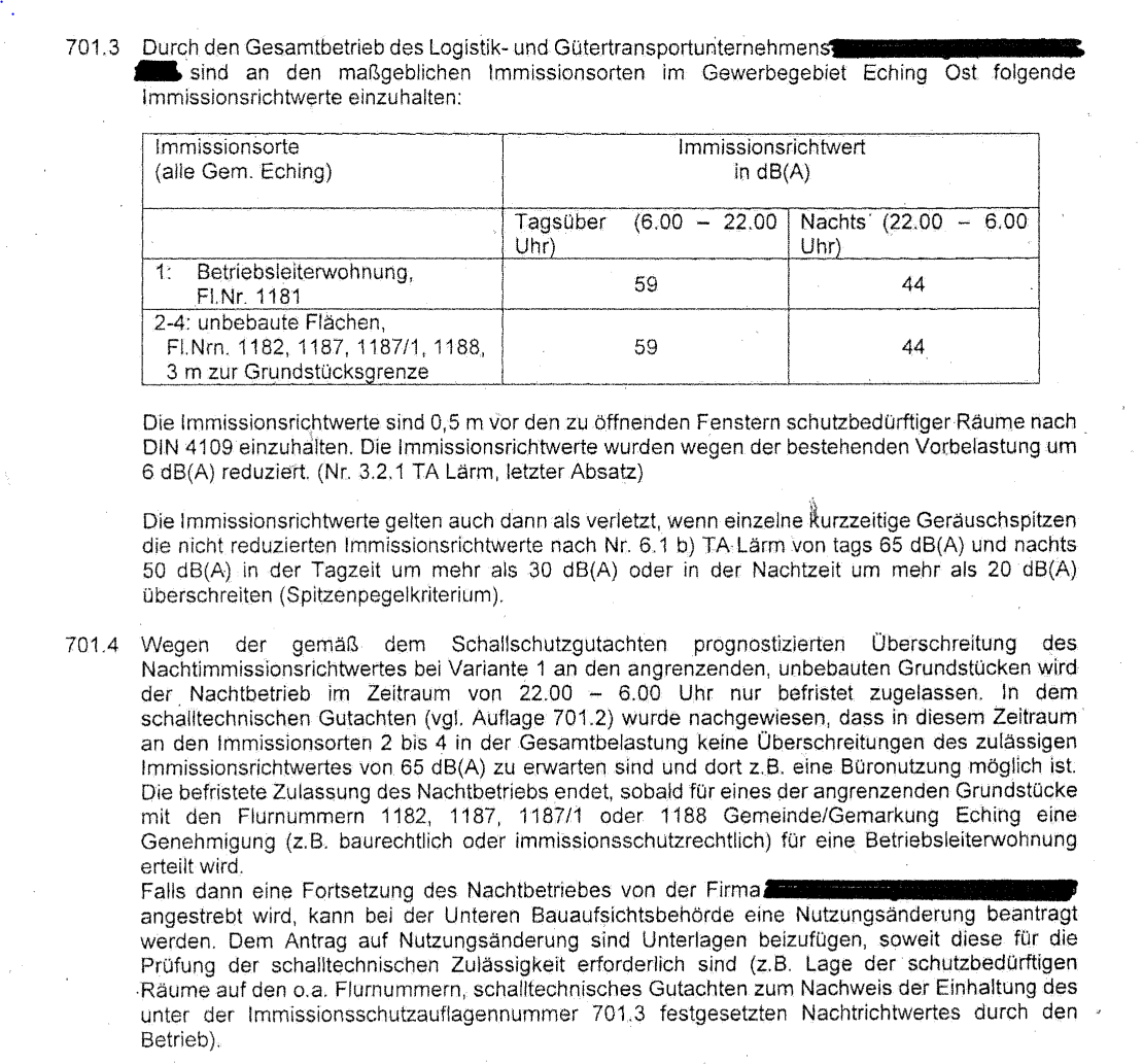 2.1 Die streitgegenständlichen Auflagen sind in Hinblick auf ihre Bestimmtheit, Art. 37 Abs. 1 BayVwVfG, nicht zu beanstanden. Zwar ordnet Nr. 701.3 prima facie die Einhaltung von Nachtimmissionsrichtwerten von 44 dB(A) auf den bezeichneten Grundstücken einschränkungslos an. Es sind jedoch die Auflagen Nrn. 701.3 und 701.4 zusammen zu lesen und in der Reichweite ihres Erklärungsinhalts gemeinsam zu betrachten. Denn beide treffen Regelungen im Zusammenhang mit den durch das Vorhaben verursachten Immissionen auf den Nachbargrundstücken. Im Ergebnis ergibt bei einer solchen gemeinsamen Betrachtung der beiden Auflagen für die in Nr. 701.3 getroffene Festlegung eines Immissionsrichtwerts für die unbebauten Flächen (Grundstücke FlNrn. 1182, 1187, 1187/1, 1188) für die Nachtzeit von 44 dB(A) in Zusammenschau mit der in Nr. 701.4 getroffenen Regelung, dass dieser Richtwert erst dann Anwendung finden soll, wenn für eines der genannten Grundstücke die Genehmigung für eine Betriebsleiterwohnung erteilt wird. Das ist der Sache nach eine aufschiebende Bedingung im Sinne von Art. 36 Abs. 2 Nr. 2 BayVwVfG. So wird in Auflage Nr. 701.44 ausgeführt, dass durch das im Baugenehmigungsverfahren vorgelegte Schallschutzgutachten nachgewiesen worden sei, dass bei der Verwirklichung der Variante 1 (s. hierzu Nr. 12 des Schalltechnischen Gutachtens vom 26. Mai 2021 – beabsichtigter Betriebsablauf ohne Lärmschutzmaßnahmen) nachts keine Überschreitungen des Immissionsrichtswerts von 65 dB(A) an den Immissionsorten 2-4 zu erwarten seien und dort z.B. eine Büronutzung zulässig sei. Weiter heißt es, dass die Zulassung dieses Betriebsablaufes ende, sobald für eines der betroffenen Nachbargrundstücke eine Genehmigung für eine Betriebsleiterwohnung erteilt werde. In der Zusammenschau ergibt sich also, dass Nr. 701.4 eine aufschiebend bedingte Zulassung einer Betriebsvariante darstellt, bei der die in Nr. 701.3 angeordneten Immissionsrichtwerte nicht eingehalten werden.