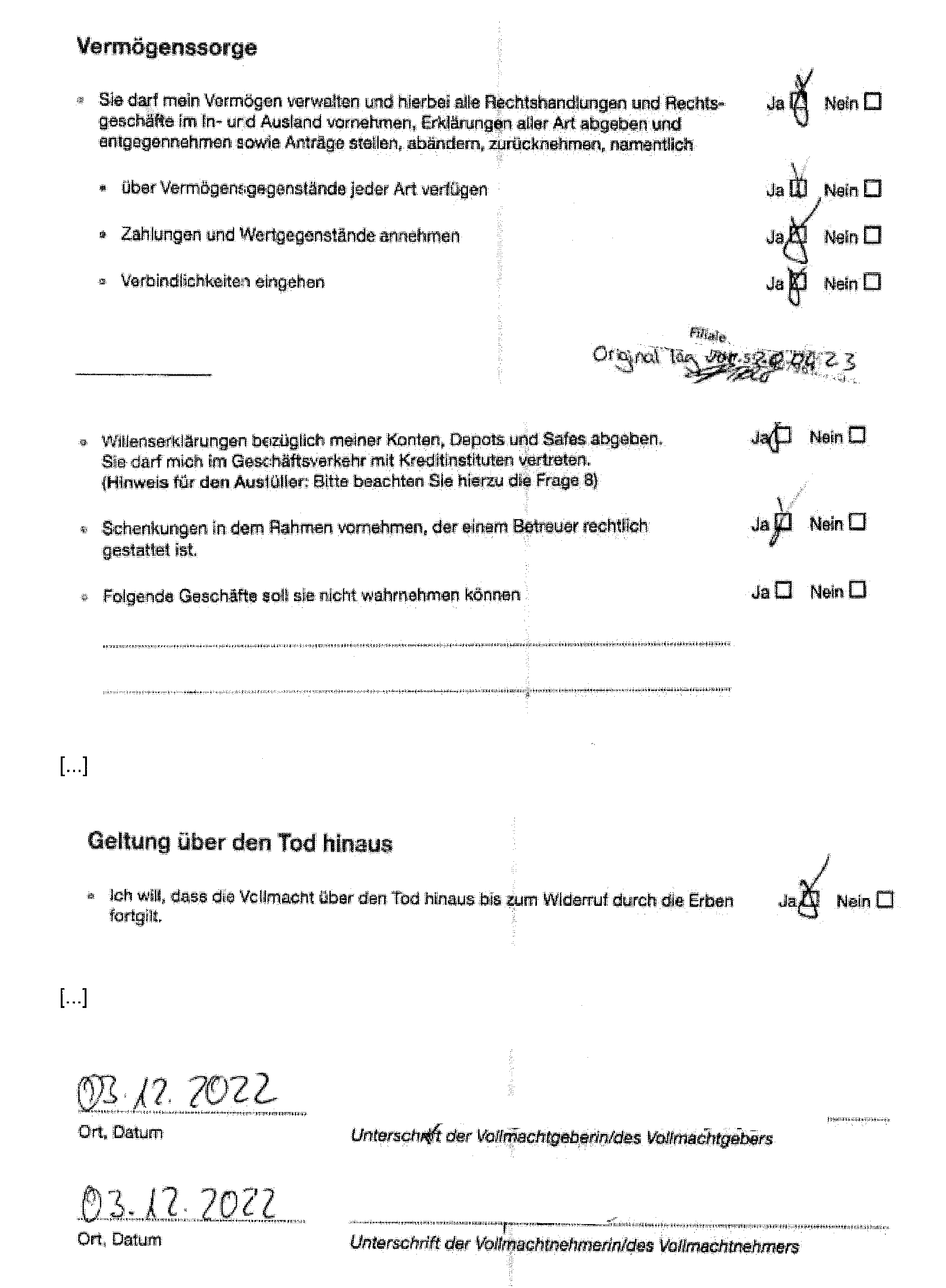 Der Erteilung einer Vorsorgevollmacht mit umfangreichen Befugnissen zugunsten des Bevollmächtigten hingegen liegt in der Regel nicht nur ein bloßes Gefälligkeitsverhältnis, sondern ein Auftragsverhältnis zugrunde (OLG Brandenburg, Urteil vom 19. März 2013 – 3 U 1/12 –, Rn. 82, juris m.w.N.), insbesondere falls ein Familienangehöriger im Rahmen einer Vorsorgevollmacht Geldgeschäfte für einen anderen Familienangehörigen vornimmt (OLG Brandenburg, Beschluss vom 1. Juni 2023 – 3 U 47/23 –, Rn. 7, juris). Ein besonderes persönliches Vertrauensverhältnis zwischen Auftragnehmer und Auftraggeber spricht in der Regel nicht gegen einen Auftrag im Sinne von § 662 BGB (OLG Brandenburg, Beschluss vom 1. Juni 2023 – 3 U 47/23 –, Rn. 7, juris m.w.N.).