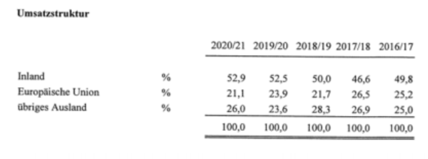 Auf weitere Nachfrage, wie weit das Geschäftsmodell der Klägerin von ausländischen Lieferungen abhängig sei, teilte diese in einer weiteren Stellungnahme der Geschäftsführung mit, sie habe sich bewusst diversifiziert, um auf nationale Wirtschaftsschwankungen stabiler zu reagieren und Wachstumspotentiale in internationalen Märkten heben zu können. Sie habe eine hohe Exportquote (ebenda Bl. 83 f.):