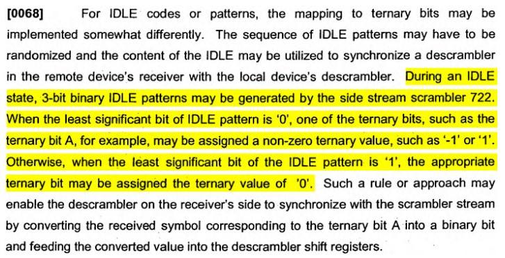 map 3-bit binary IDLE patterns of the scrambled 3-bit packet stream with a nonzero least significant bit to a zero ternary value of said one or more ternary bits streams scramble said 3-bit packet stream; ”