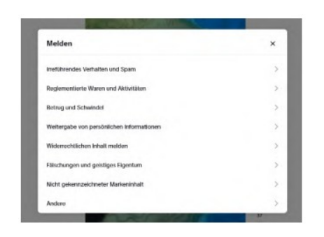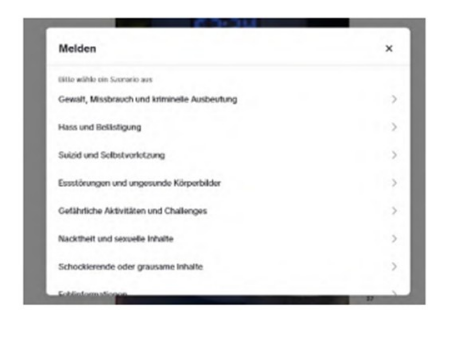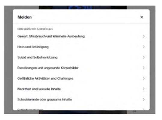 2. Die Webseite der Beklagten enthält zudem eine Funktion, die Nutzern die Meldung konkreter Inhalte ermöglicht. Hierzu müssen sie über die drei Punkte oben rechts in dem Beitrag die Schaltfläche „Melden“ anwählen. Es öffnet sich dann ein Drop-Down-Menü mit zahlreichen Auswahlmöglichkeiten, unter anderem „Gewalt, Missbrauch und kriminelle Ausbeutung“, „Hass und Belästigung“, „Suizid und Selbstverletzung“, „Essstörungen und ungesunde Körperbilder“, „gefährliche Aktivitäten und Challenges“, „Nacktheit und sexuelle Inhalte“, „schockierende oder grausame Inhalte“, „widerrechtlichen Inhalt melden“, „Fälschungen und geistiges Eigentum“. Wegen der vollständigen Ausgestaltung wird auf die Anlage K 5 Bezug genommen.