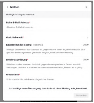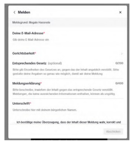 , bei dem lediglich beim Klick auf „Widerrechtlichen Inhalt melden“ eine Eingabemaske wie folgt erscheint: