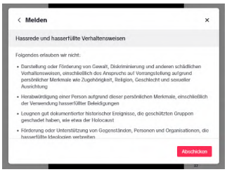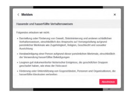 Nach einem Klick auf „Hass und Belästigung“ öffnet sich eine weitere Auswahlmöglichkeit „Hassrede und hasserfüllte Verhaltensweisen“ und „Belästigung und Mobbing“, anschließend ein Hinweis und der Button „Abschicken“. Zum Verlauf im Detail wird auf die Anlage K 5 Bezug genommen. Entsprechendes gilt für alle übrigen Schaltflächen bis auf die mit „Widerrechtlichen Inhalt melden“ betitelte.