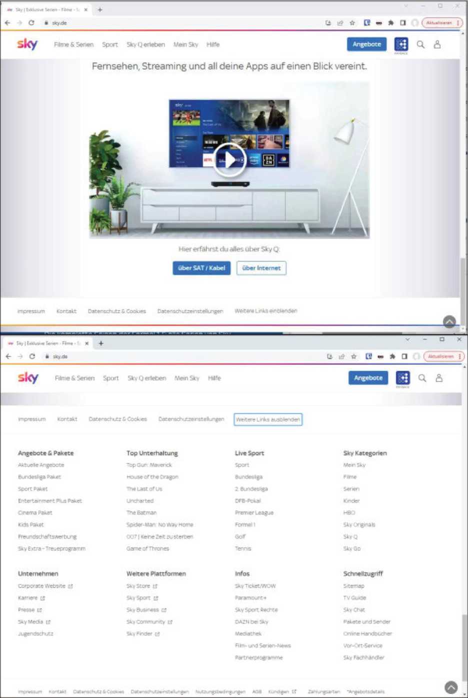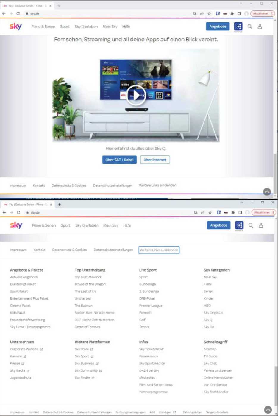 Ruft man die Webseite der Beklagten unter https://www.s....de auf, so ist am unteren Bildschirmrand eine Schaltfläche mit der Aufschrift „Weitere Links einblenden“ zu finden. Diese Schaltfläche ist in grauer Schrift auf weißem Hintergrund ausgestaltet. Es wird dabei auf das Bild auf Blatt 7 der Klageschrift vom 29.03.2023 verwiesen. Nach dem Klick auf die Schaltfläche „Weitere Links einblenden“ erscheinen im oberen Bereich der Webseite die Links zu den Themen „Angebote & Pakete“, „Top Unterhaltung“, „Live Sport“, „S... Kategorien“, „Unternehmen“, „Weitere Plattformen“, „Infos“ und „Schnellzugriff“. Diese einzelnen Themenbereiche sind fett hervorgehoben. Unterhalb von diesen insgesamt 58 Links befindet sich in kleinerer und grauer Schrift (RGB-Wert 74,74,74) eine Schaltfläche mit der Aufschrift „Kündigen“. Diese Schaltfläche befindet sich auf der unteren rechten Seite der streitgegenständlichen Webseite. In der Zeile mit dem Button „Kündigen“ befinden sich die in gleicher Weise formatierten Schaltflächen „Impressum“, „Kontakt“, „Datenschutz & Cookies“, „Nutzungsbedingungen“ und „AGB“.