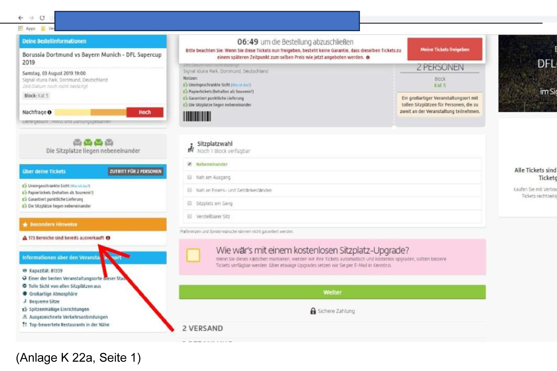 Während des Testkaufs erschienen mehrere Angaben zur Verfügbarkeit der Karten (wiedergegeben im LGU, Seite 10/11), die ebenfalls Gegenstand der Klage sind. Namen und Anschrift des Verkäufers wurden dem Käufer nicht genannt, weder vor noch nach dem Vertragsschluss (Anlage K 16). Dies greift der Kläger ebenfalls an.
