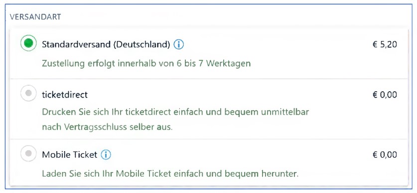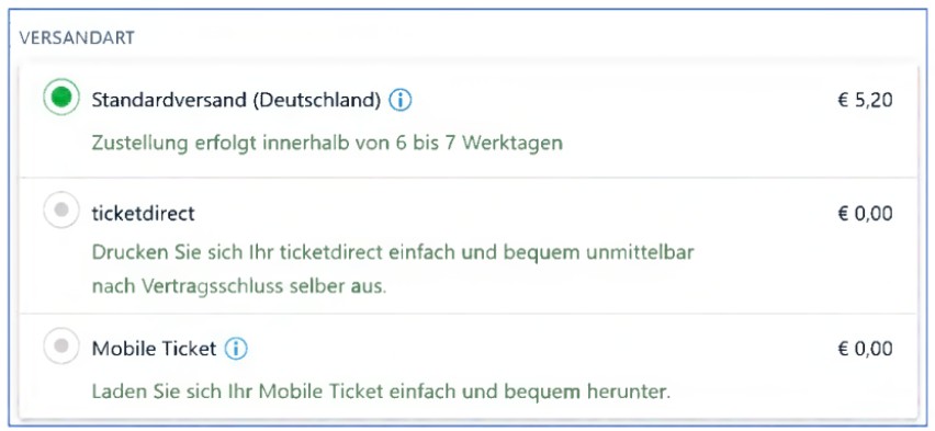 Im Rahmen des Bestellvorgangs für Tickets fand sich für deren Versand folgende Maske auf dem Internetportal der Beklagten, wobei die kostenpflichtige Variante des Standardversands für € 5,20 vorbelegt war, die zusätzlichen, erst nach einem Ausklappen (Pulldown) sichtbaren kostenfreien Möglichkeiten zum direkten Ausdruck oder zum Herunterladen auf ein mobiles Endgerät dagegen aktiv angeklickt werden mussten (Abbildung 4 der Klageschrift):