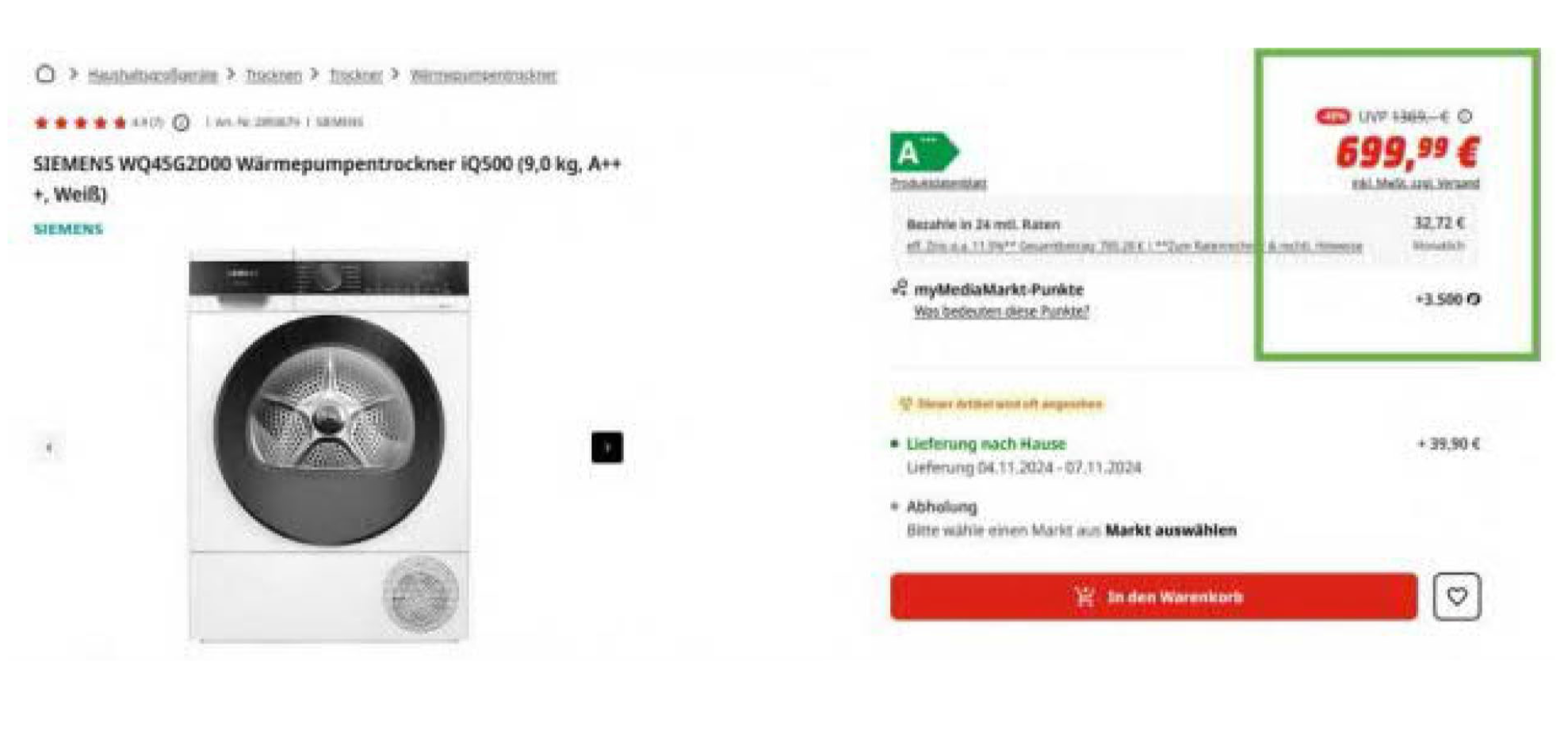 Die Beklagte bewarb am 28.10.2024 auf der vorgenannten Internetseite die nachfolgenden Elektrogeräte in der jeweils dargestellten Weise.