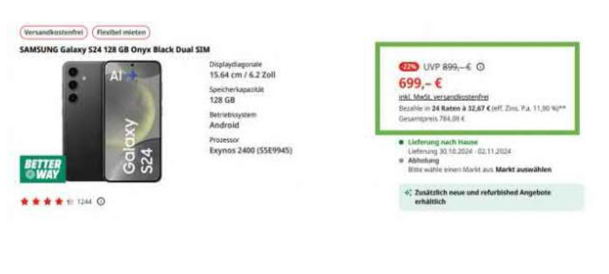 Dabei wurde dem Kaufpreis, der in größerer Schriftgröße, in Fettdruck und roter Farbe gehalten war, eine in deutlich kleinerer Schriftform abgefasste mit einem negativen Vorzeichen versehene Prozentangabe in einer rot hinterlegten Kachel, gefolgt von der Buchstabenkombination UVP und einer durchgestrichenen in derselben Größe gehaltenen Preisangabe vorangestellt. Der jeweils durchgestriche Preis entsprach der aktuellen unverbindlichen Preisempfehlung des jeweiigen Herstellers.