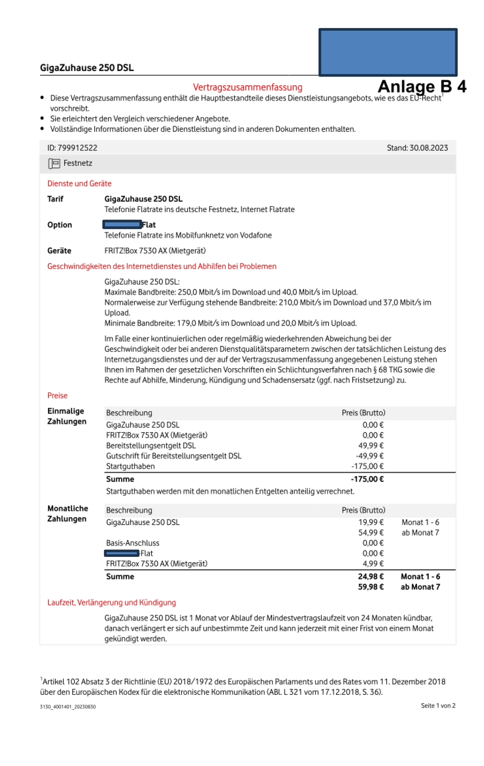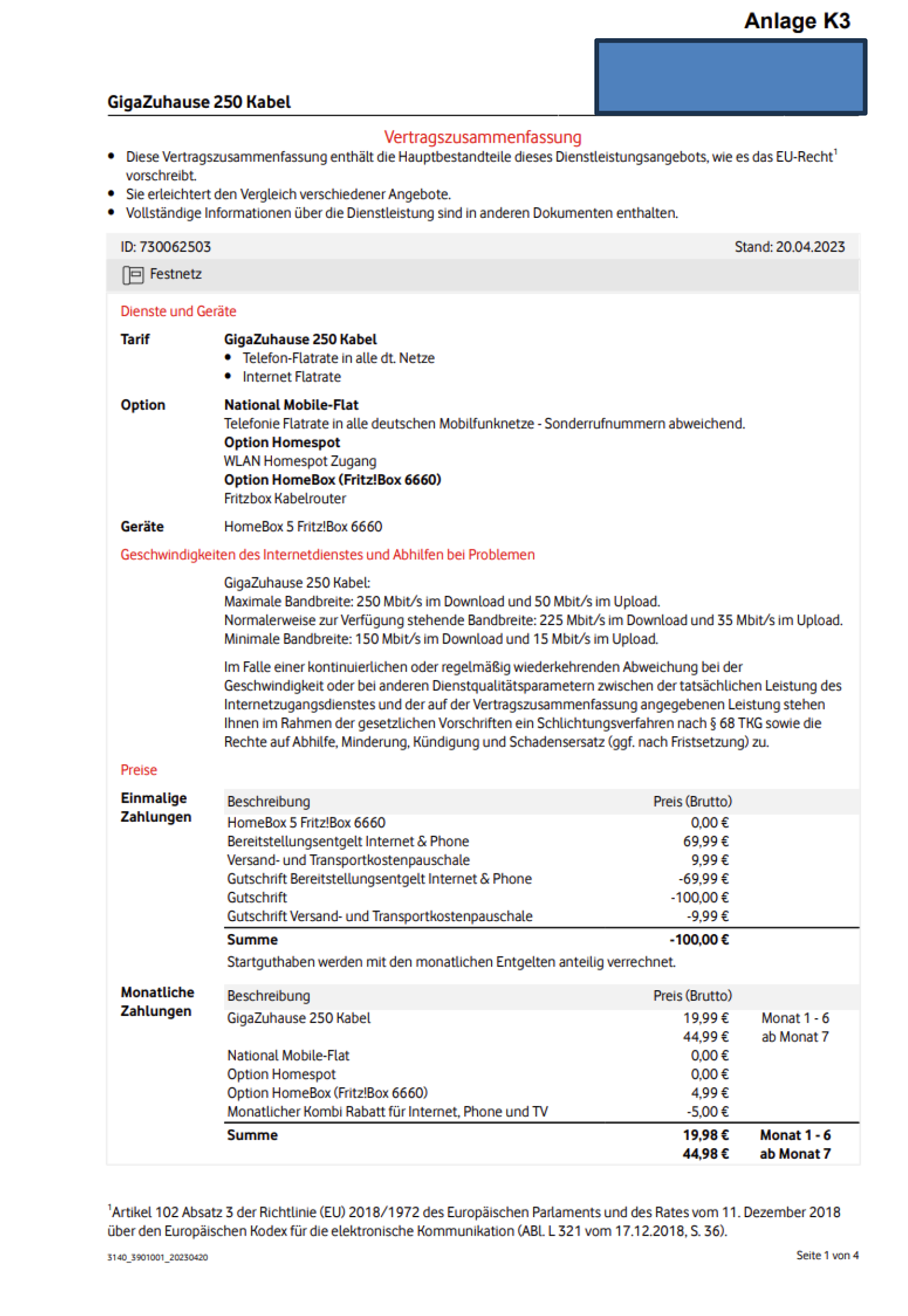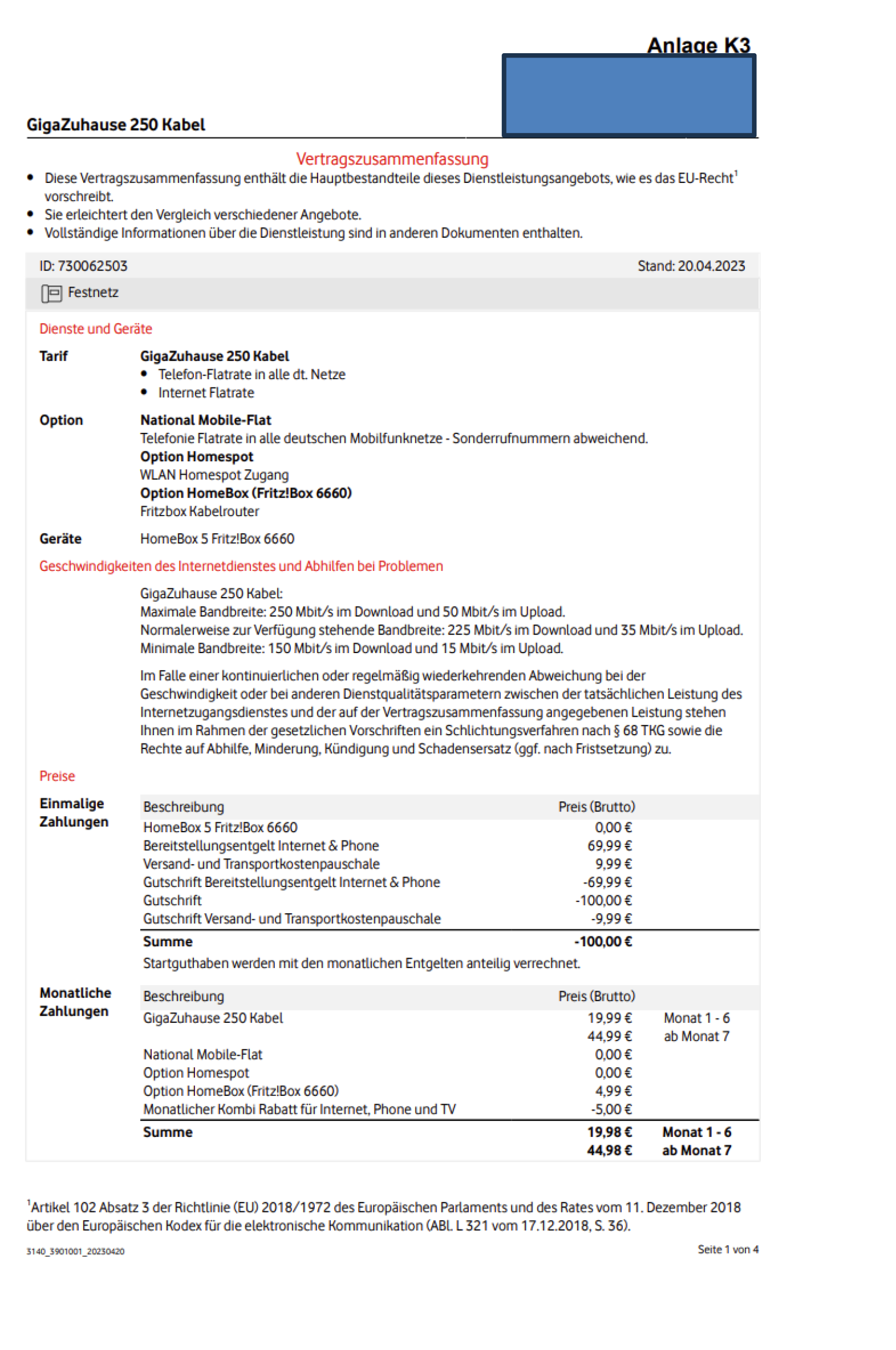 Als letzten Bestellschritt unter dem Reiter „4. Angaben prüfen“ stellte die Beklagte in einem herunterladbaren pdf-Dokument für den Dienst „GigaZuhause 250 Kabel“ samt „Fritz!Box 6660“ sowie den Dienst „GigaTV“ jeweils eine Vertragszusammenfassung bereit: