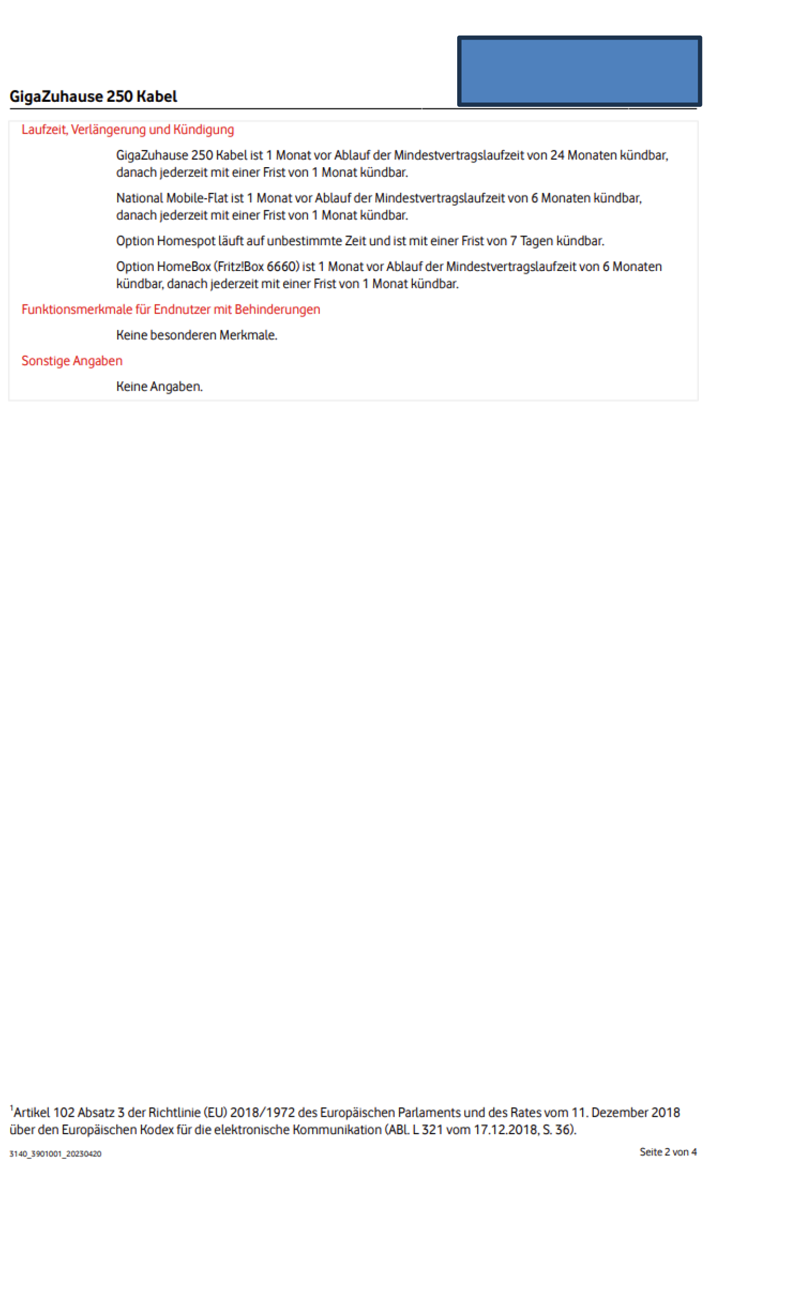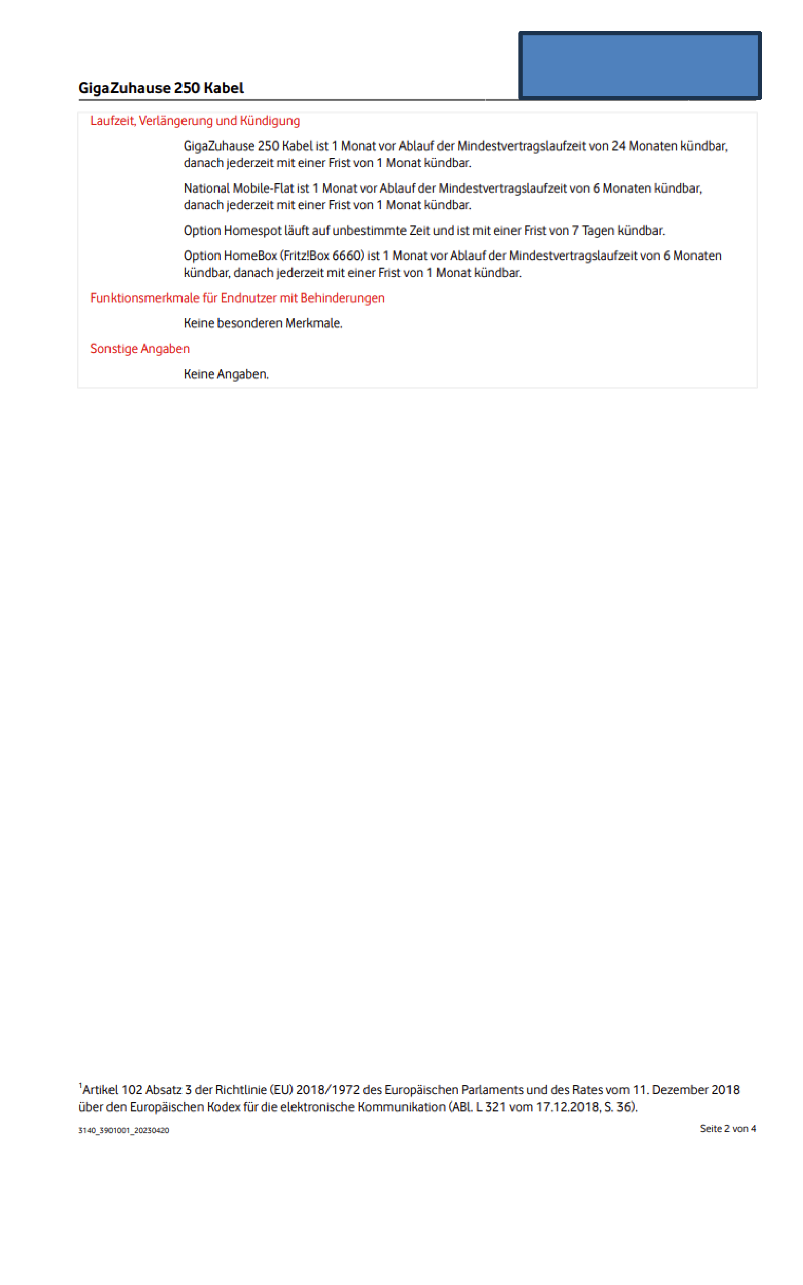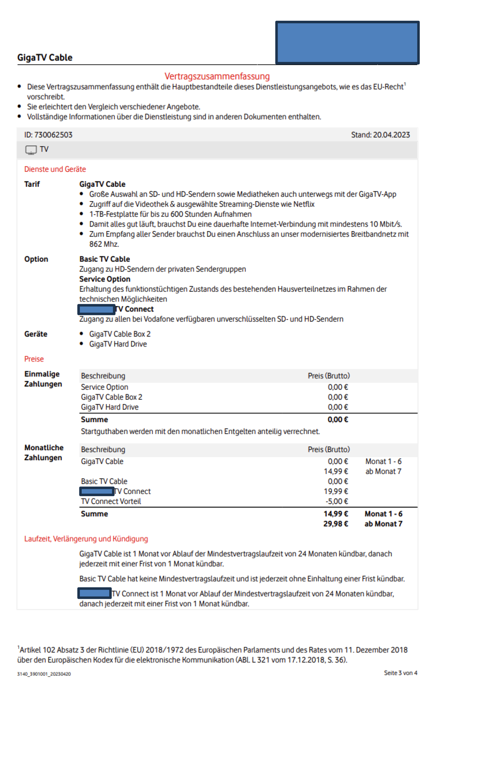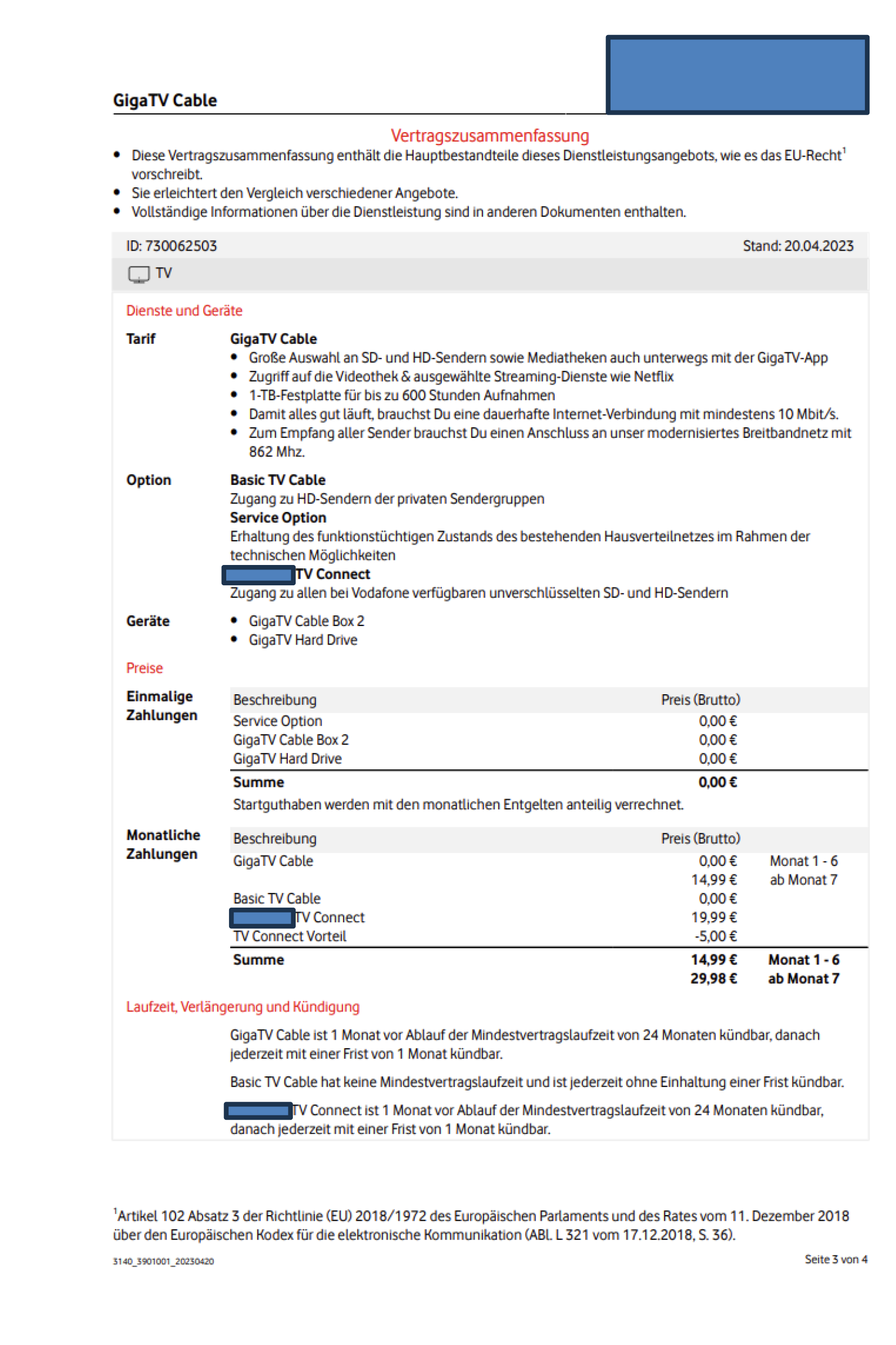 Als letzten Bestellschritt unter dem Reiter „4. Angaben prüfen“ stellte die Beklagte in einem herunterladbaren pdf-Dokument für den Dienst „GigaZuhause 250 Kabel“ samt „Fritz!Box 6660“ sowie den Dienst „GigaTV“ jeweils eine Vertragszusammenfassung bereit: