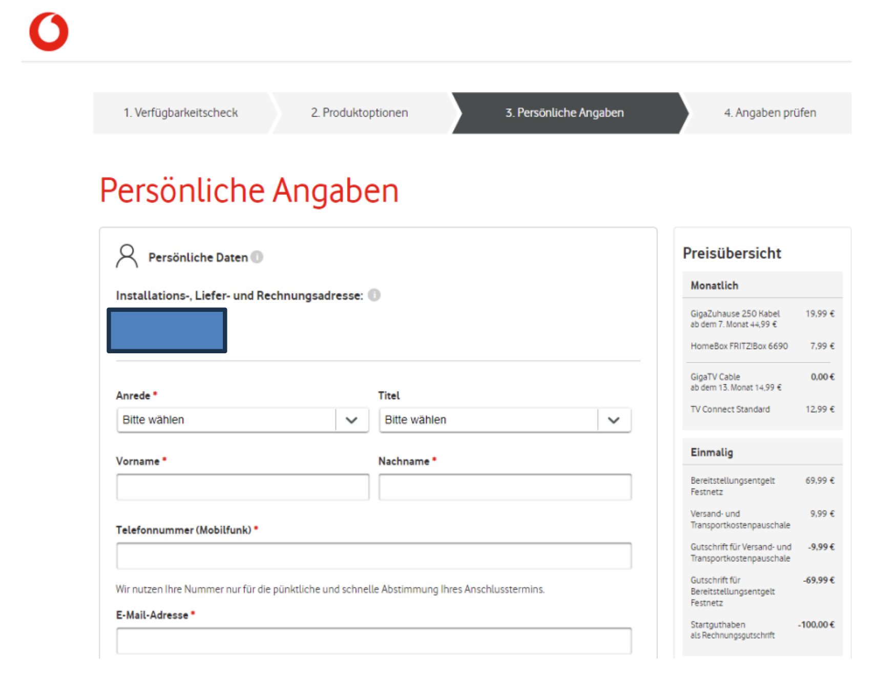 Wählten Verbraucher den Link „Ja, GigaTV bestellen“ aus, wurden sie zu einer Seite weitergeleitet, auf der sie ihre persönlichen Angaben in eine Dateneingabemaske eintragen mussten. Rechts in der Preisübersicht wurden die gewählten Telekommunikationsdienstleistungen aufgeführt: