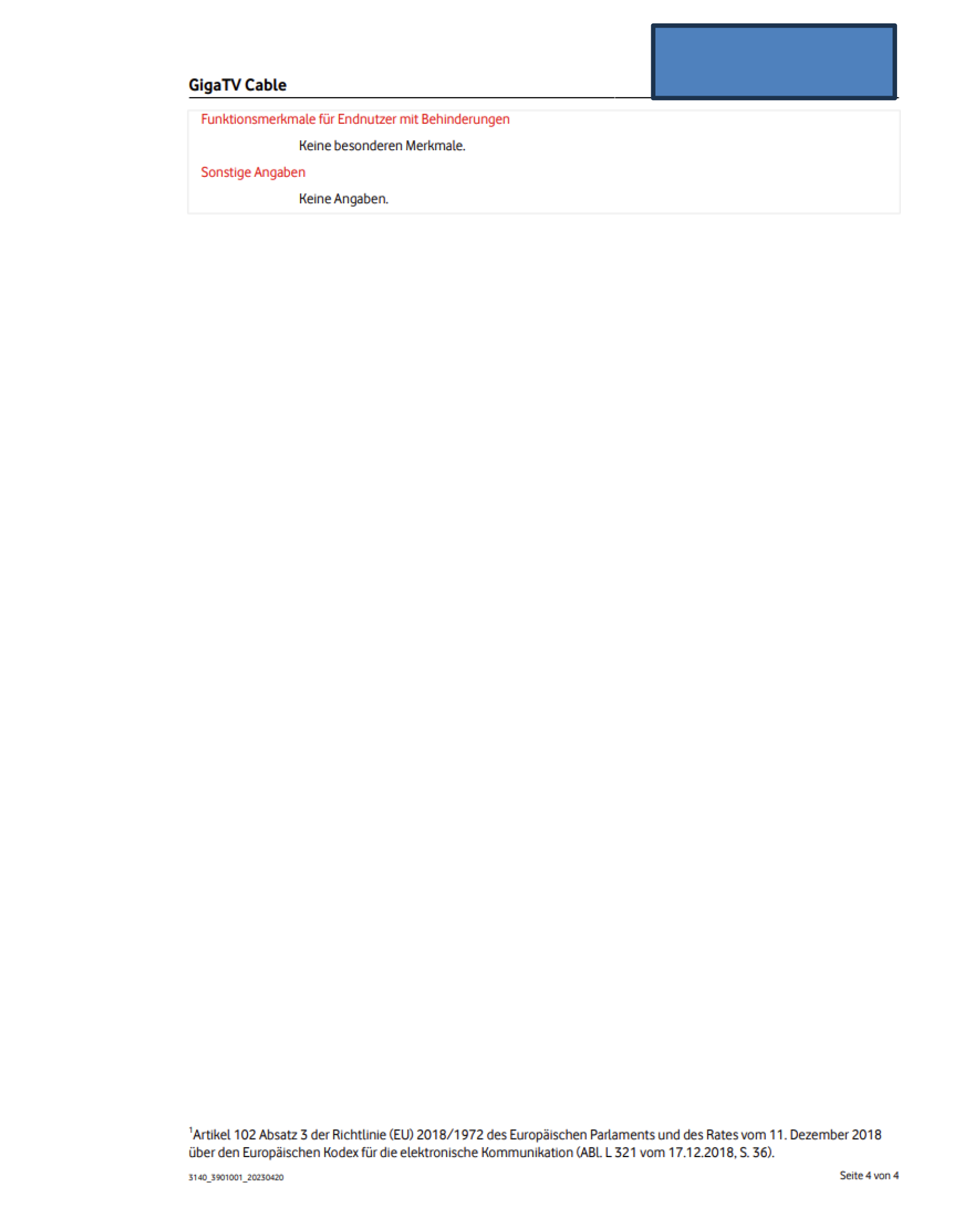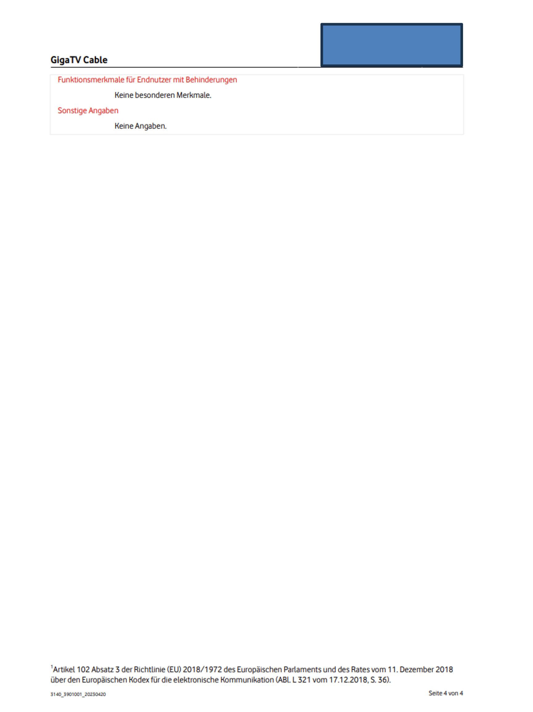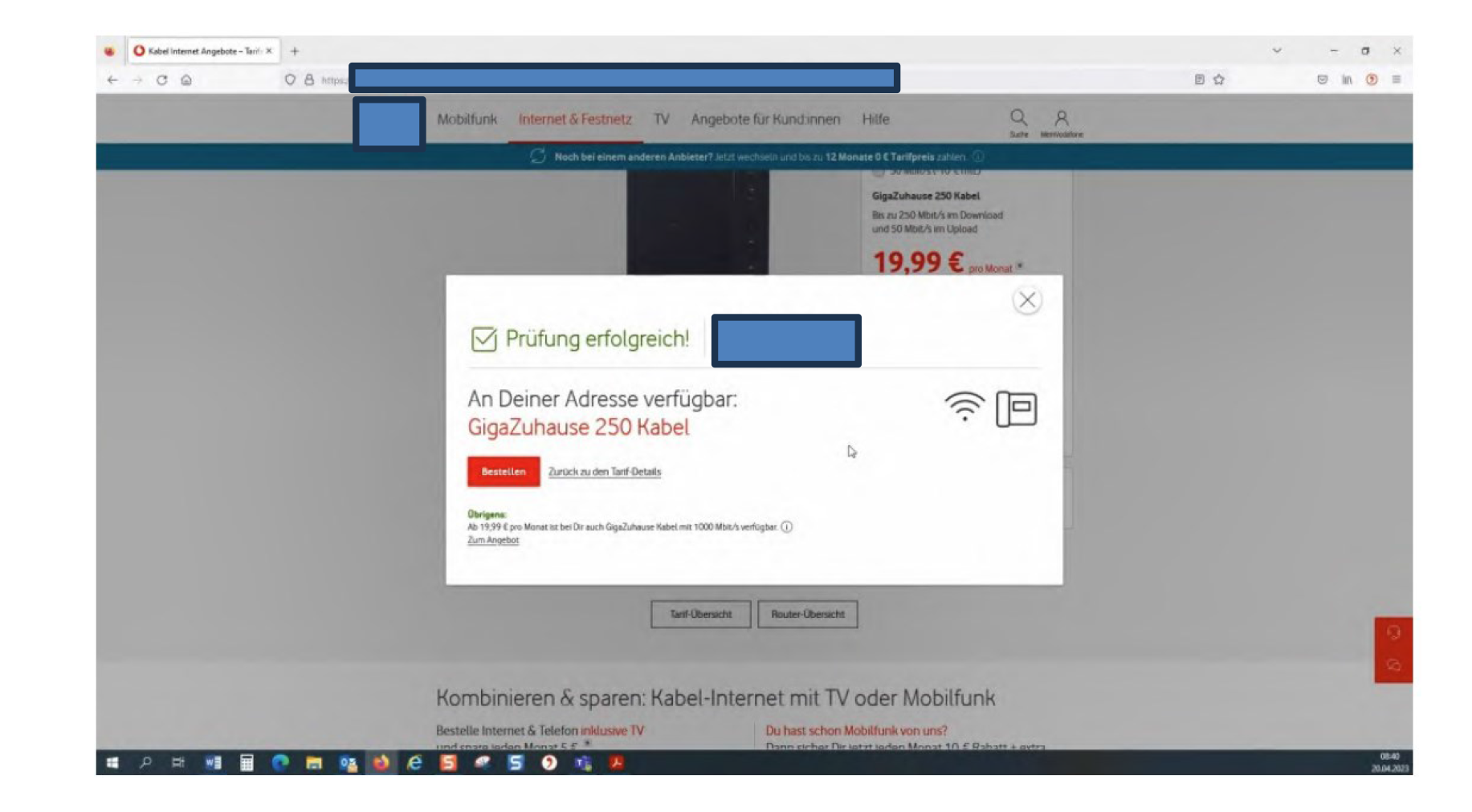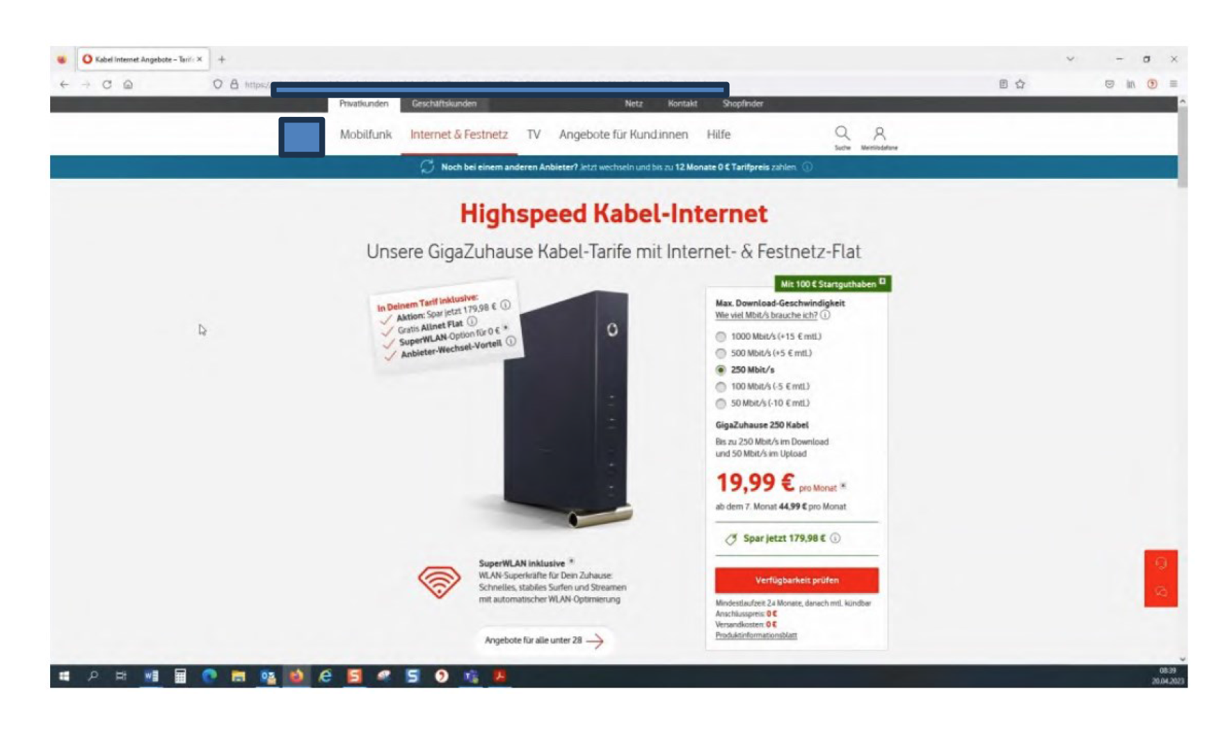 Die Beklagte bot am 20.04.2023 auf der Internetseite www.v....de in der Rubrik „Internet & Festnetz“ den Internet- und Telefontarif „GigaZuhause 250 Kabel“ sowie den Fernsehzugangsdienst „GigaTV“ an: