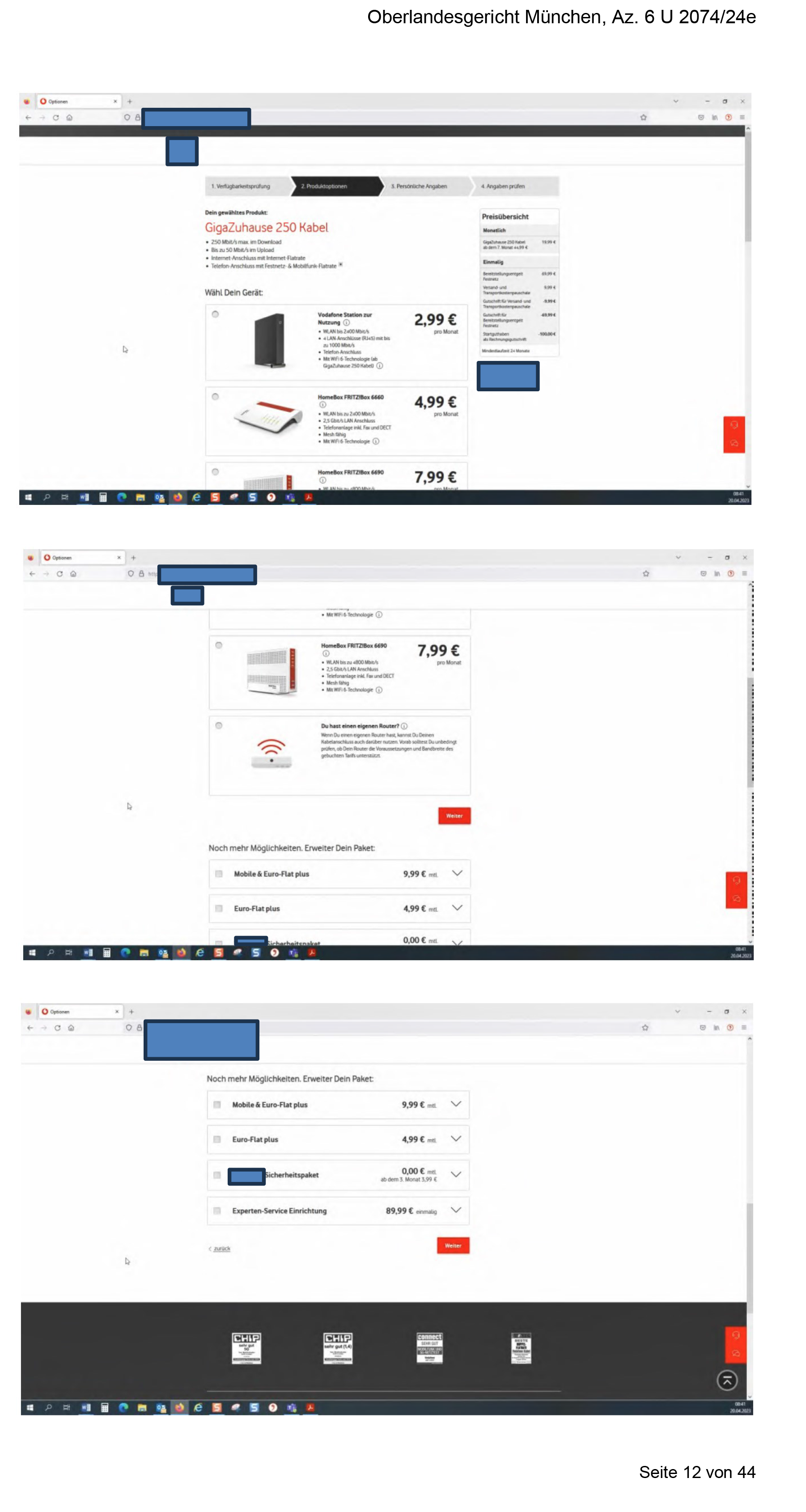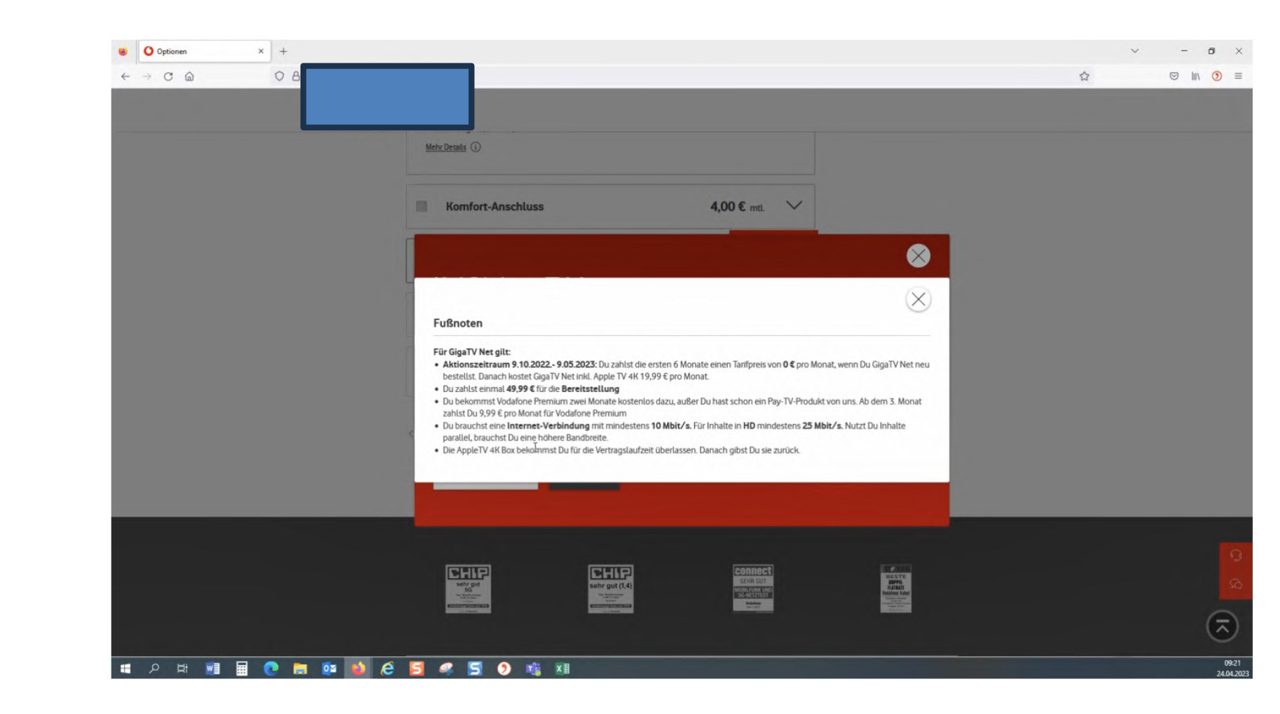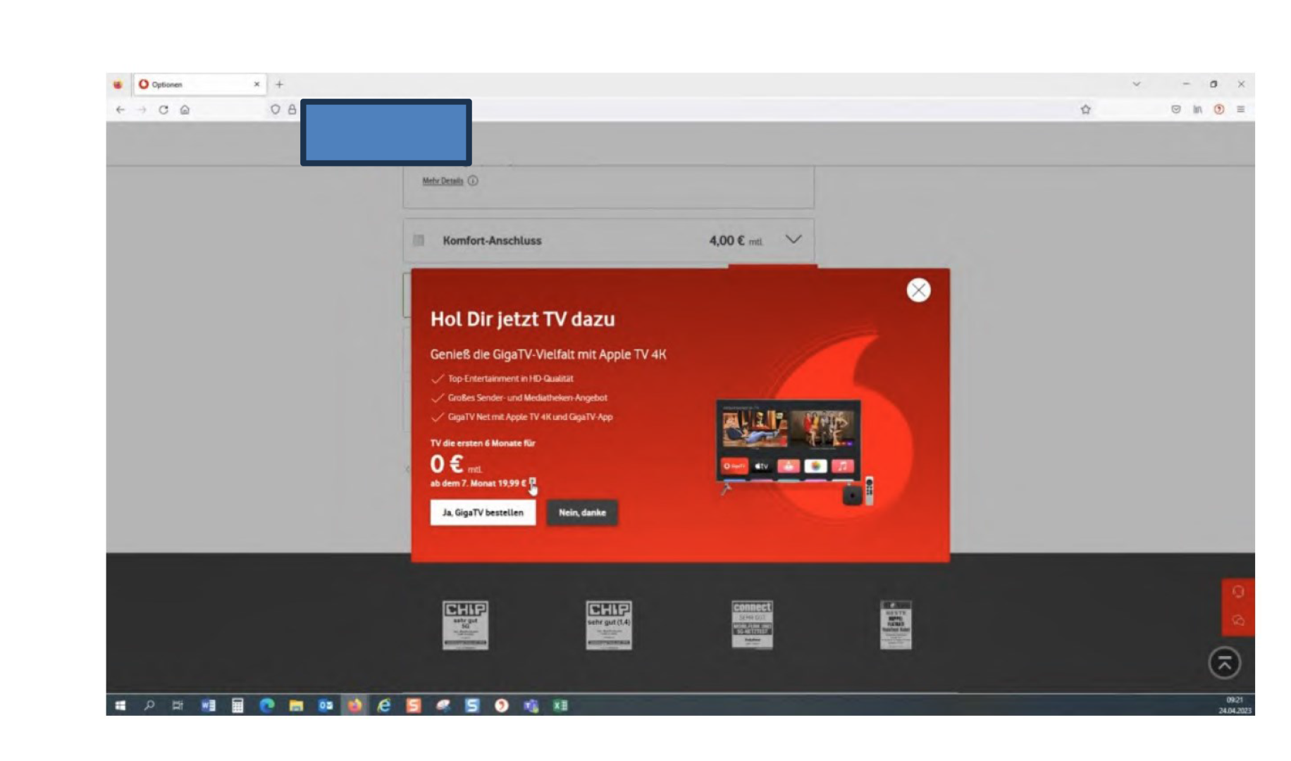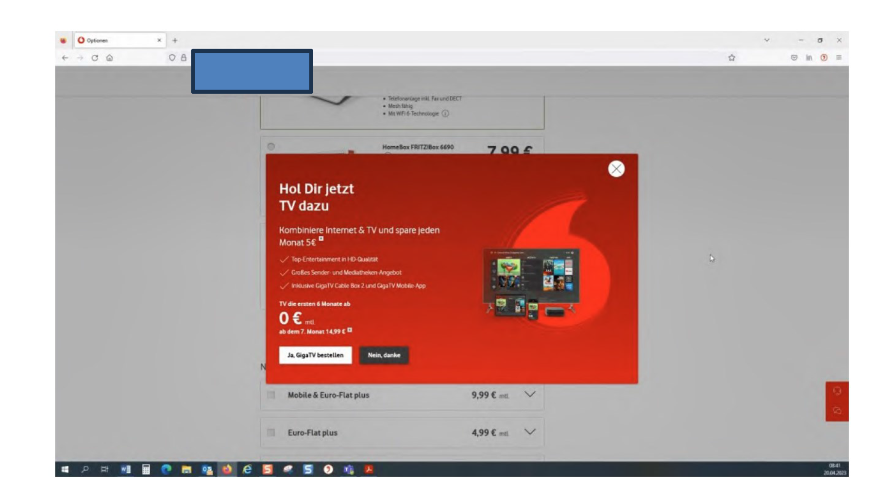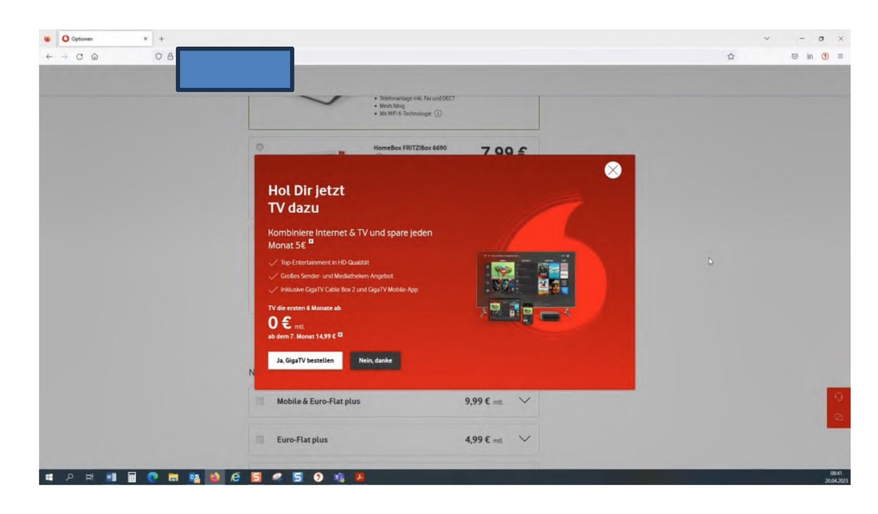 Wählten Verbraucher das Gerät „Fritz!Box 6660“ zu 4,99 EUR monatlich aus und klickten danach auf den Link „Weiter“, öffnete sich ein PopUp-Fenster mit Werbung für das TV-Angebot „GigaTV“. Dieses wurde für die ersten sechs Monate kostenfrei, danach für 14,99 EUR monatlich angeboten, wenn es mit dem Angebot „GigaZuhause 250 Kabel“ zusammen bestellt wurde: