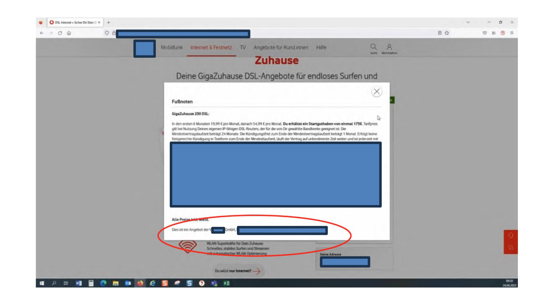 Hinsichtlich des Angebots für das Produkt „GigaZuhause 250 DSL“ war ein Hinweis auf die V GmbH als Vertragspartner abrufbar: